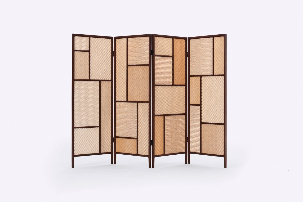 屏风采用四曲叠扇屏制式,屏框以黑胡桃木制成,“上下”二字变化成长短线条,将单屏分隔成大小框格,三种不同密度和纹理的竹丝镶嵌花板嵌入其中。框间以活动钮接合,可折成任意角度,自行直立,也可合成一具,收纳存放。屏风素雅简洁,屏框纤细,外方内圆,镶板为天然竹色,错落的框格和拼镶肌理的变化是所有的装饰。因为竹片厚度和拼镶密度的差异,在光线的折射下,不同的框格会呈现深浅不一的颜色。随着时间流动和光线移动,屏风不同的曲折角度,都会带来不同的光影感受,为当代居住空间带来韵味。