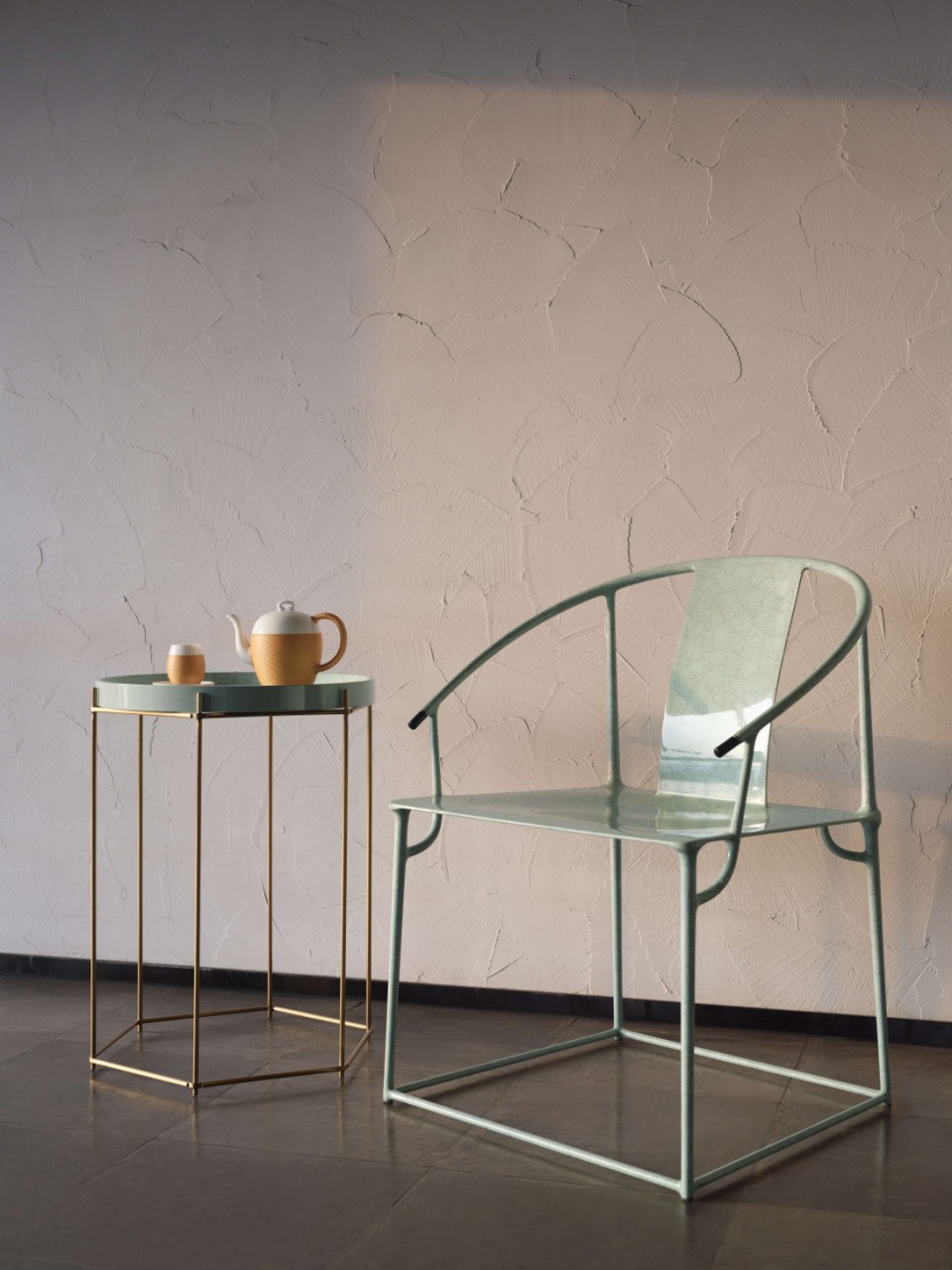 SHANG XIA上下髹蛋壳漆碳纤维大圈椅,以天然鸭蛋壳髹饰工艺叠加现代碳纤维结构,重构明式家具的当代语汇。设计汲取明代圈椅造型精髓,线条流畅舒展,椅背圆融如抱。结构内部延续传统榫卯工艺,在简约中蕴含古法巧思,打造具有文化气质的当代家具作品。椅背线条灵动舒展,椅身轻盈挺拔。坐垫采用牛皮革包覆,柔软贴合。表面肌理细密,如瓷片碎裂般自然铺陈,隐现光泽,展现独有的东方工艺之美。SHANG XIA上下蛋壳漆作品,选用天然鸭蛋壳经手工镶嵌碎贴、打磨、抛光,再覆以多层漆面漆,融合于漆面之中。蛋壳肌理细密自然,莹润生辉,如碎瓷铺展,静谧雅致,成就独一无二的表面肌理。