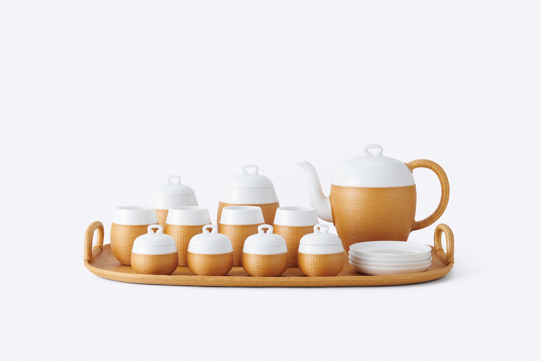 “桥”象征着人与人、传统与现代的联结和对话,彼此理解而创新跨越。全系器物包含茶具、花瓶和烛台。将白瓷与竹编工艺精妙结合,工艺师只用一把简单的刀,将竹子劈成细丝,紧贴瓷面编织,竹编的每一处接头藏而不露,巧夺天工,赋予白瓷新生,茶器因竹编更具保温隔热的功能,弥足珍贵。竹编工艺早在远古时代就已诞生,而SHANG XIA上下的“竹丝扣瓷”采用“双线交叉走丝”的立体编织工艺,经篾和编篾都增加到两根,编织效果大为提升。白瓷茶杯经1300度以上高温烧制而成,器物经过火的历练,质地更为坚固细腻,适合冲泡各类茶饮,忠实呈现茶的本味。延续古代经典器型“桥形钮”,茶具造型纤细轻巧,与壶身巧妙融合。无论一壶好茶还是一套好的茶具,都是联系家人好友的纽带。凝聚着跨越与创新的力量,也借由器物的温度传递给你。一杯茶,几颗茶糖或点心,悠享自然惬意的茶趣时光,套装中特别搭配有点心碗、糖罐和托盘,赠礼或自用,在多元风味里漫想生活。