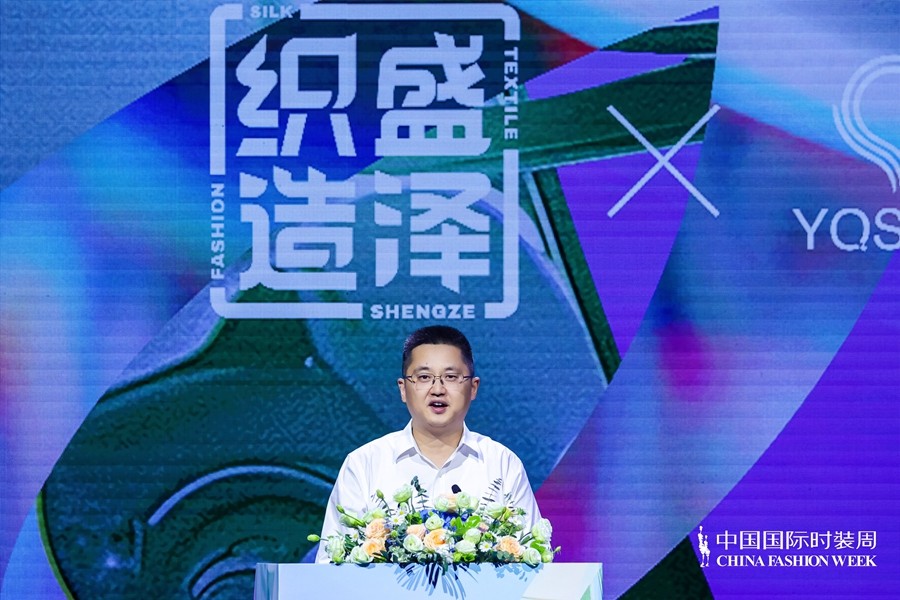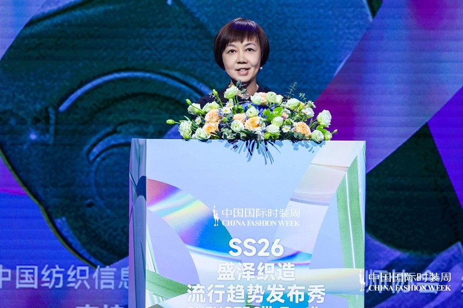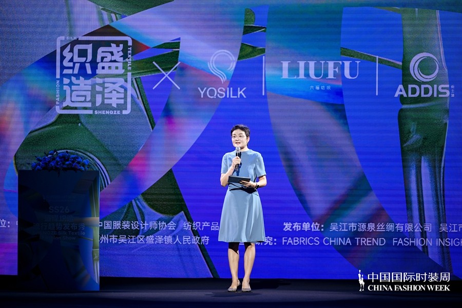 中国纺织工业联合会副会长阎岩在致辞中表示,作为区域品牌工程的核心,“盛泽织造”不仅是一张产业名片,更是一项系统工程。它以本土优质面料为根基,以趋势研究为前瞻引领,以设计创意为表达路径,通过深耕设计、技术创新、品牌建设等多维度领域,持续赋予了“织造”更广阔的审美空间与深层文化表达。今天的发布秀不仅将集中展示盛泽原产面料与原创设计在时尚产业链前端的独特优势,更以“融通”万象的视野与格局、开放多元的设计表达、前瞻引领的趋势洞察,推动中国面料设计与品牌塑造走向更高端、更广阔的价值版图。这是盛泽在中国国际时装周的高光时刻,更是盛泽作为国内重要面料高地、时尚策源地的生动注脚。
