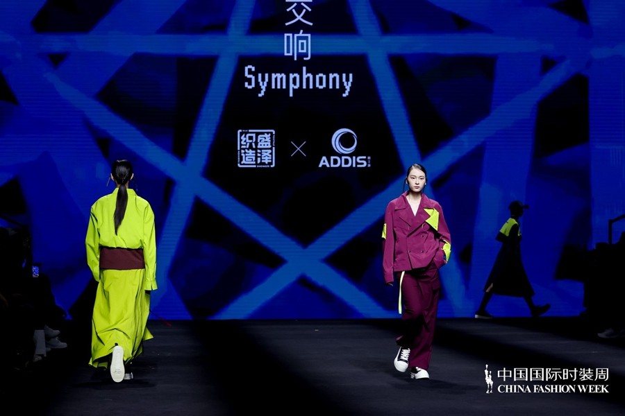“交响”系列由江苏雅士迪集团有限公司协办呈现。系列聚焦都市运动风尚,以功能性户外面料融汇简洁廓形,展现自在灵动的生活态度。轻盈尼龙与科技面料在拼接与印花中释放张力,既兼顾舒适防护,又赋予造型鲜明的时尚气质。