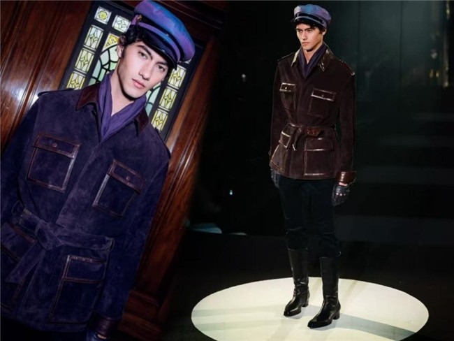 此外,棱纹千鸟格天鹅绒套装在经典图样与现代剪裁间之间探索的精妙平衡,“雾霾紫”翻毛麂皮拼皮夹克、经典黑色系灯芯绒直筒裤、创新解构的天然羊毛针织马甲等,借由时尚语言与“黄金时代”的跨时空对话,实现了复古情怀向着现代审美的灌注,使得经典元素在时尚的转译中既焕发了贴合当代审美的鲜活生机,又承载了岁月记忆的沉淀质感。