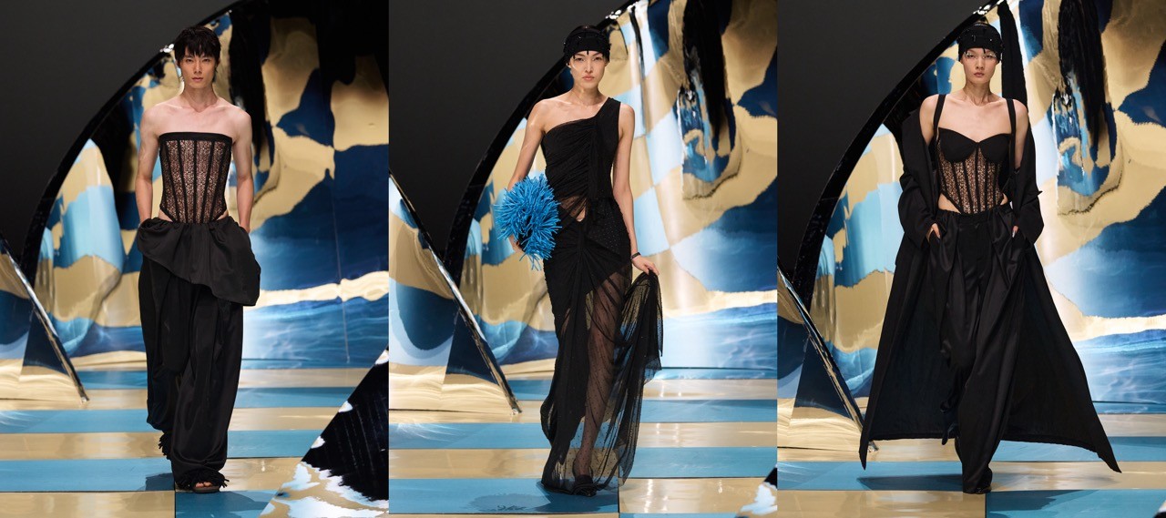 月相从不执着于圆满,而在于阴晴圆缺中展现的生命力。RuirUiruI本季借月相盈缺传递态度,以薄纱的柔韧呼应新月的可能性,用珠片的璀璨对应满月的丰盛,让解构的剪裁诉说残月的深邃。当模特行走于镜面之间,服装上的月相轨迹与地面倒影虚实交叠,仿佛在诉说:真正的风格从非定格于某一刻的完美,而是坦然拥抱每一次蜕变的过程——正如月相循环,藏在那永不停歇的变化之中。