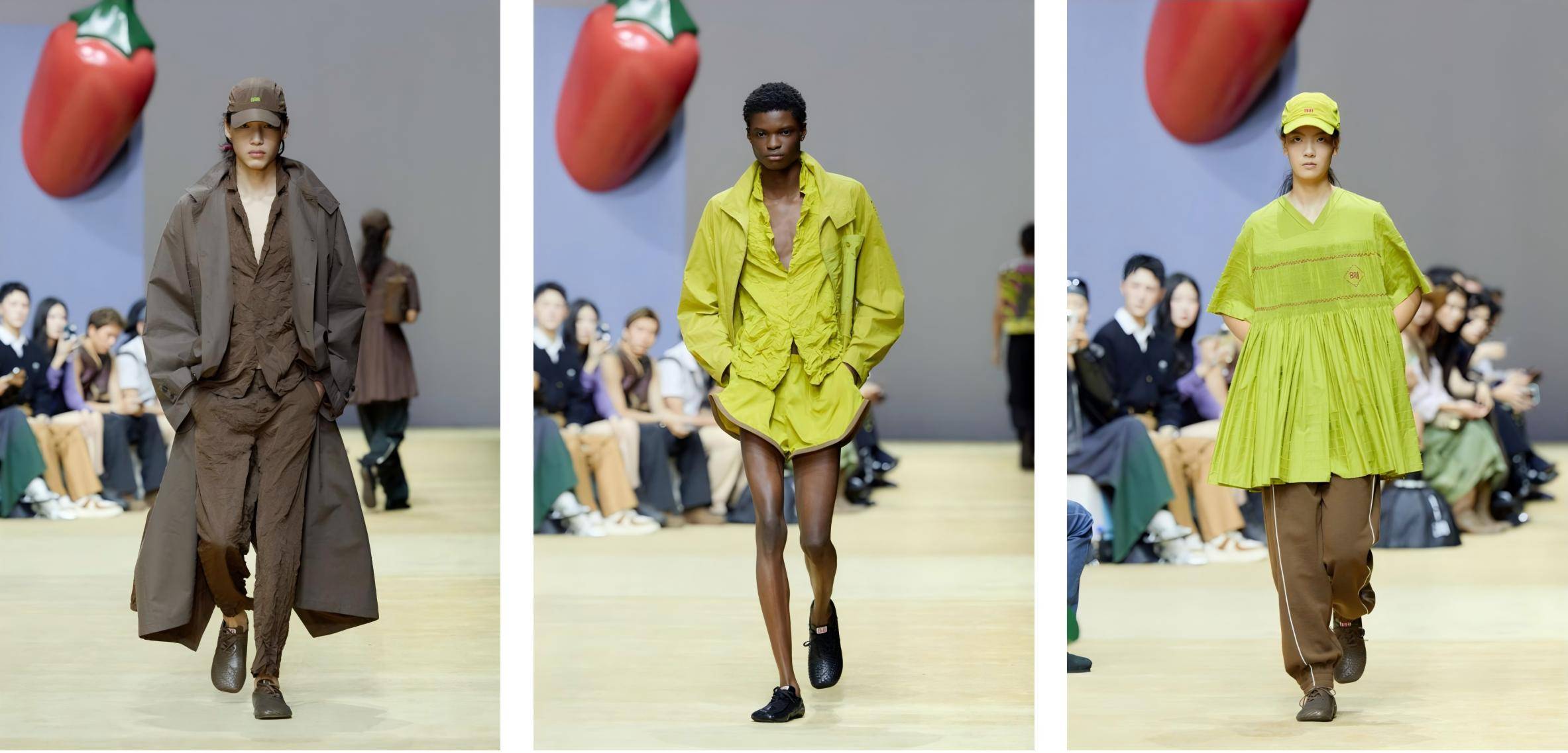 这便是8ON8本季的独特运镜,一如既往的荒诞架空的城市生活。本季融入城市路跑文化、传统手工压褶和编织工艺。设计师龚力以超现实主义的视角诠释外收内放的城市运动者形象,将当代城市新中产内心对自然的向往和对追逐的渴望,用具体视觉热烈表达:流动的缩褶刺绣服饰、手工编织的皮质跑鞋展现出手工技艺与科技面料完美交融。大地色系的陶土红与充满活力的霓虹色调碰撞出兼具松弛与动态感的轮廓,新鲜脱俗的民族手工艺与城市通勤风格的巧妙融和,传达出身处现实却神游四海的跳脱平衡。