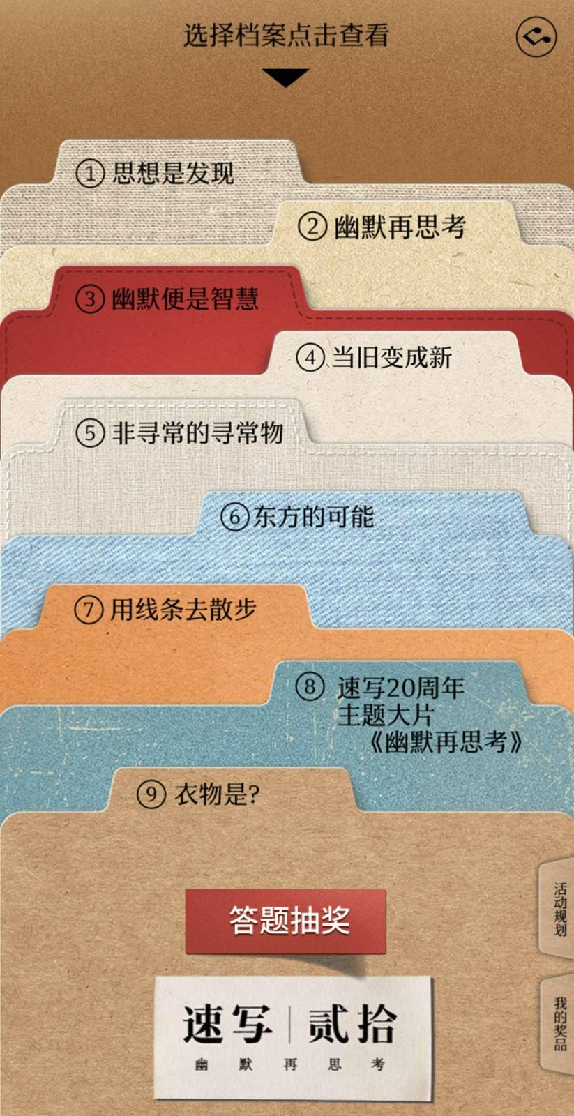 在数字空间里,速写同样翻开了一本特别的档案。速写二十周年线上展览以创意 H5 互动形式呈现,主题为「非寻常档案」,通过轻盈又充满趣味的方式,将品牌二十年来的设计沉淀与灵感积累传递给更广泛的受众。用户以探索者的身份进入线上展览,逐一翻阅档案,不同篇章对应着速写二十年间关于「幽默再思考」的探索,这些探索正是蕴藏于服饰背后的精神基因。