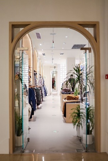Vuori北京三里屯太古里门店延续了品牌全球统一的空间美学,并融入在地化巧思。以海岸风情为灵感,店内运用“通风廊砖墙”、背光面板等细节,营造出既现代又宁静的氛围。针对空间锐角,入口处的标识墙被塑造成柔和的“海浪”形态,与弧形定制品牌标识以及绿意景观相互呼应——这一鲜活的自然元素,正是Vuori标志性美学的体现,也为顾客带来沉浸的购物氛围。
