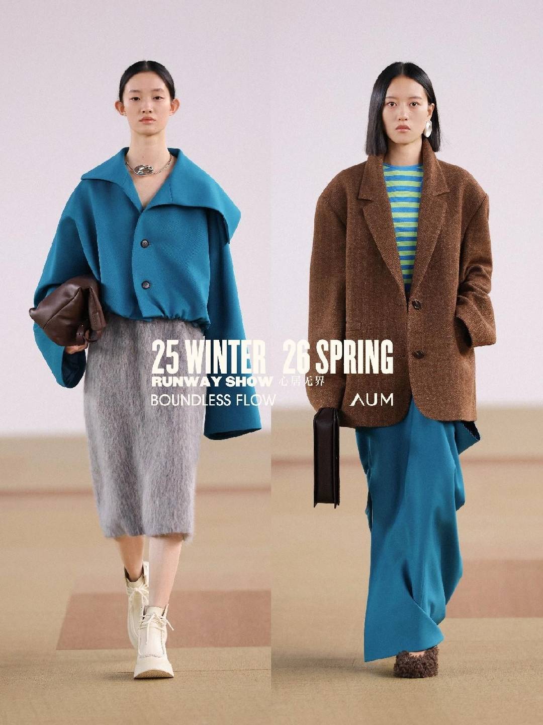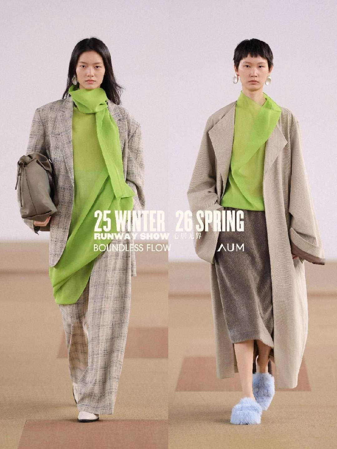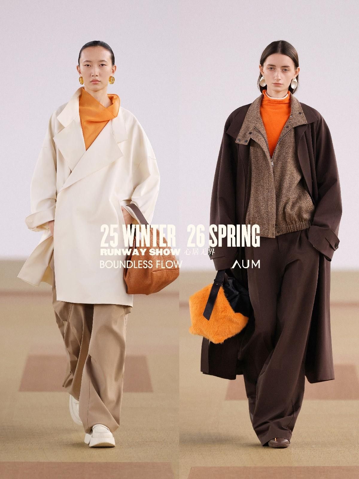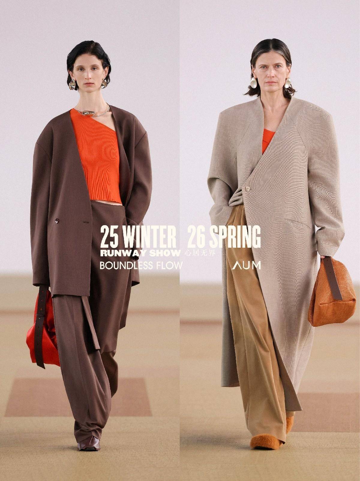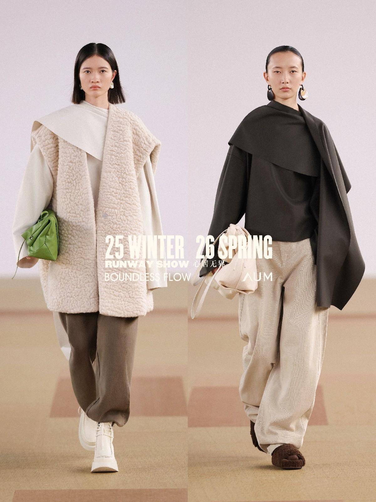 AUM「心居无界」年度大秀,延续对当代自然生活的思考,亦是对品牌理念「自然,质地有声」的再度探索与多面诠释。以顺应面料原生质地的高级设计,流动自然、都市、时装的边界。在时装中探讨和回应女性的自由精神,重塑身体空间与穿着场景的边界,呈献递出多元融合、舒适无拘的女性风格新章。