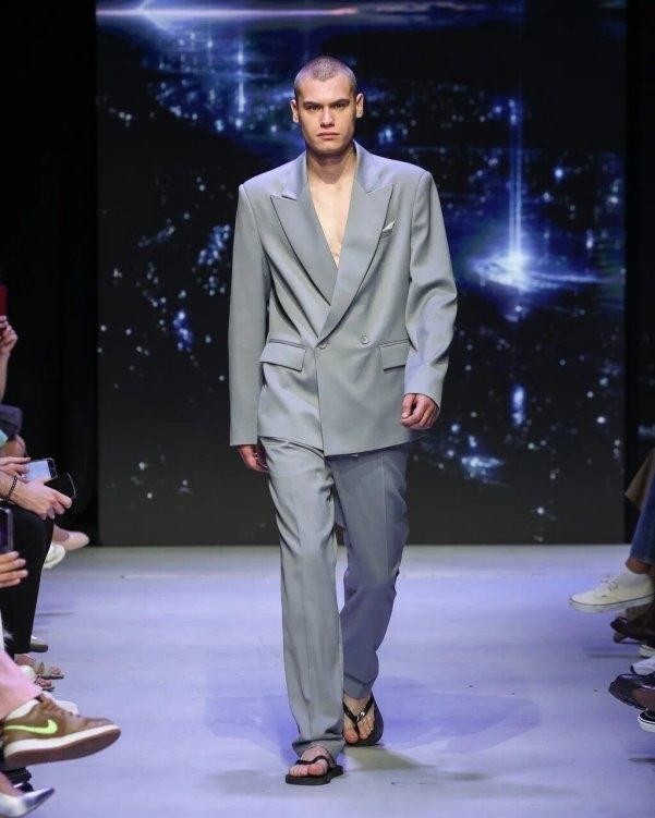 Roshi 以大胆简约的廓形,为经典男士定制服饰赋予现代诠释。这款单色灰色西装内搭真空穿着,将传统定制工艺的精髓尽显无遗,夸张垫肩、利落线条,再配上侧边线条干净利落的修身长裤,整体造型兼具雕塑感与现代感,更散发着无可置疑的阳刚气质。这正是每位真正的绅士梦寐以求的理想之选。
