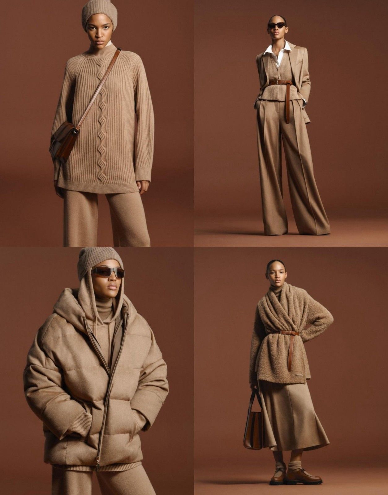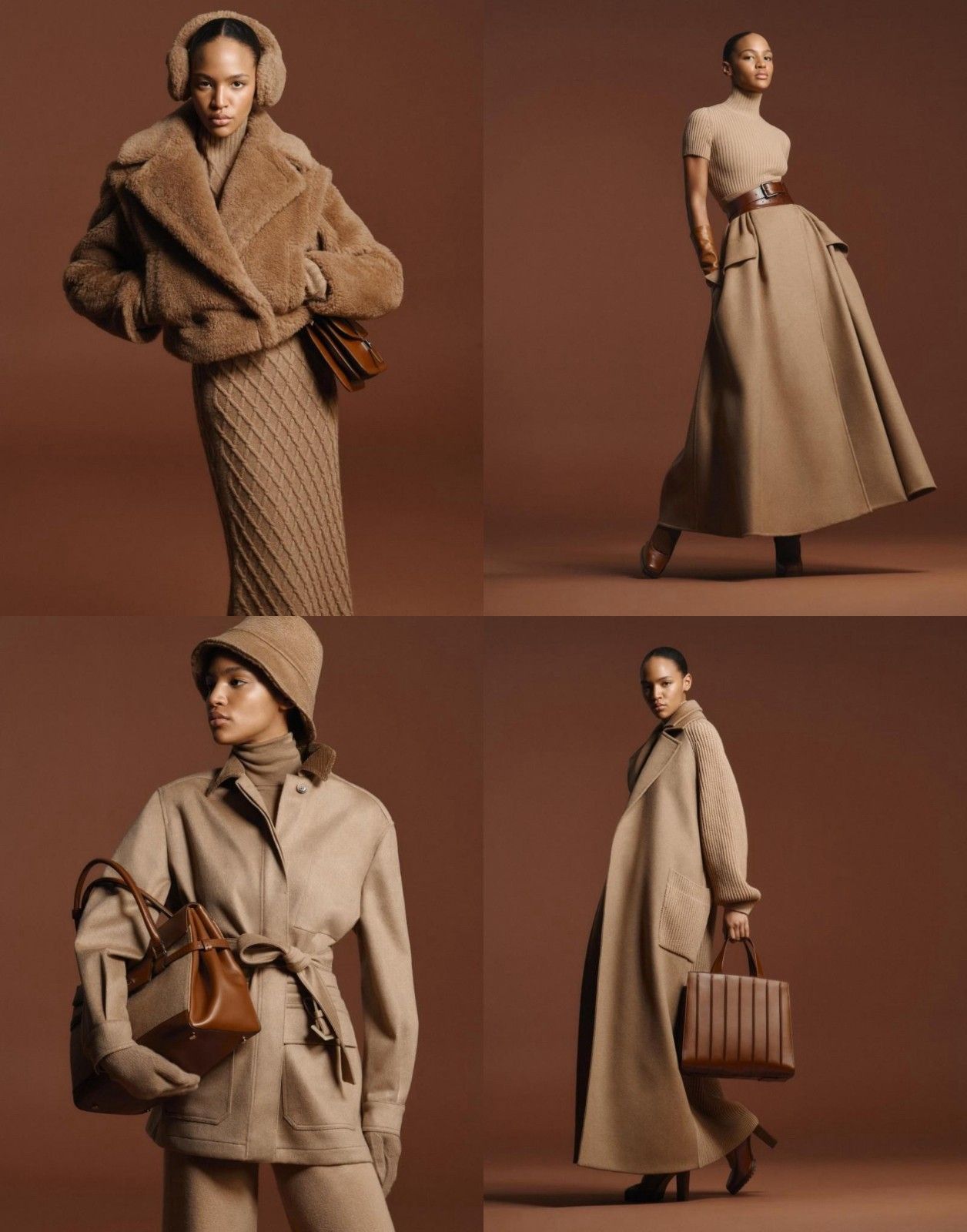 在Max Mara 2025秋冬系列中,驼色的经典魅力被进一步升华,呈现出更加丰富与立体的时尚维度。除标志性的大衣款式外,本季作品巧妙地扩展了穿搭选择。从柔软蓬松的短款毛绒外套,到剪裁利落的西装套装;从保暖舒适的连帽羽绒服,到轻盈宽松的针织开衫与A字裙,每一套造型都延续了 Max Mara 的经典美学,同时注入现代、轻松的穿着态度,展现了更多元化的穿搭可能。