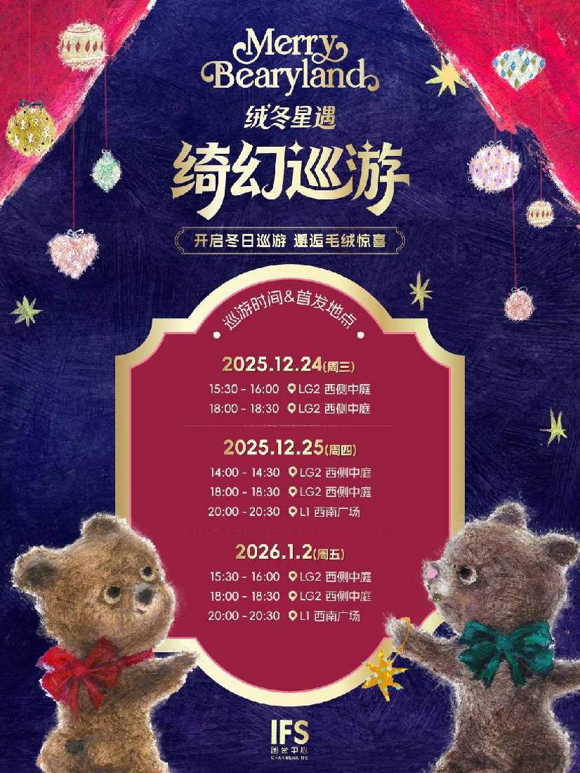 即日起至2026年1月4日,长沙IFS将为大家送上毛绒绒冬日心意,打卡“Merry Bearyland 绒冬星遇”全国首展任意装置,并关注长沙IFS小红书官方账号,拍照带话题#毛绒绒冬日心意 发布小红书平台,即可在LG2西侧中庭装置处获得长沙IFS定制冬日礼遇1份,数量有限,兑完即止。