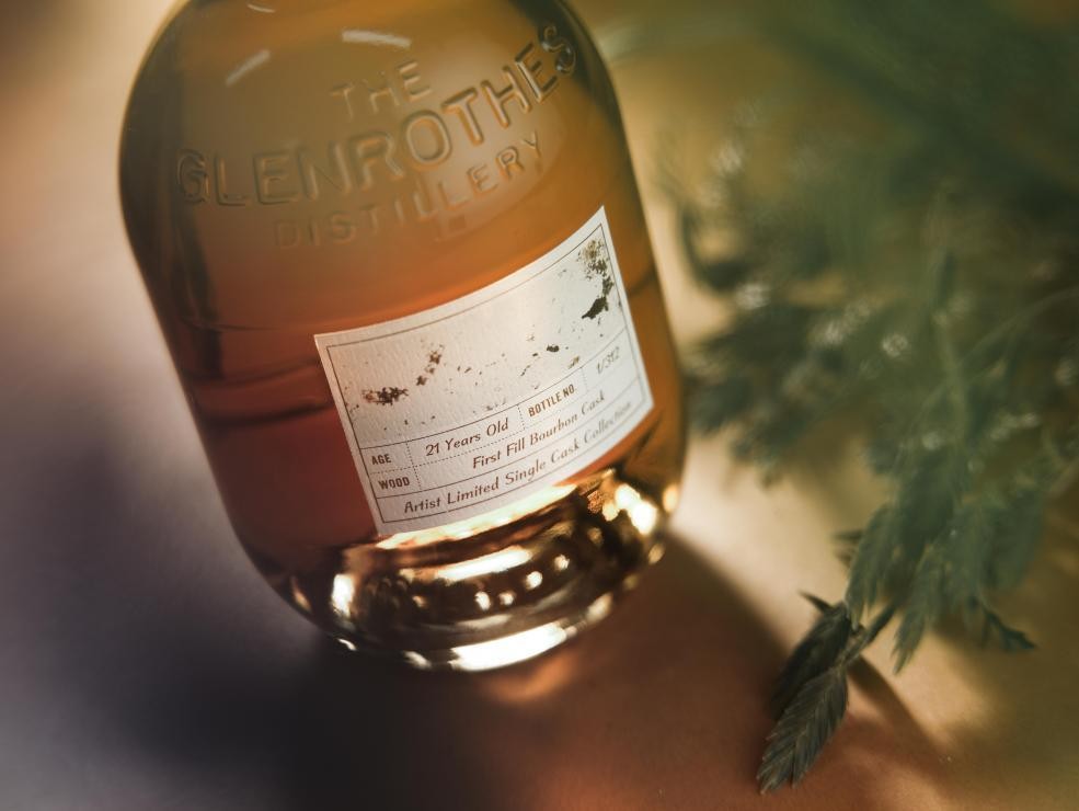 格兰路思艺术家合作单桶系列威士忌,酒标呈现《晨雾》画作局部,并包含单桶年份、瓶号及桶陈信息