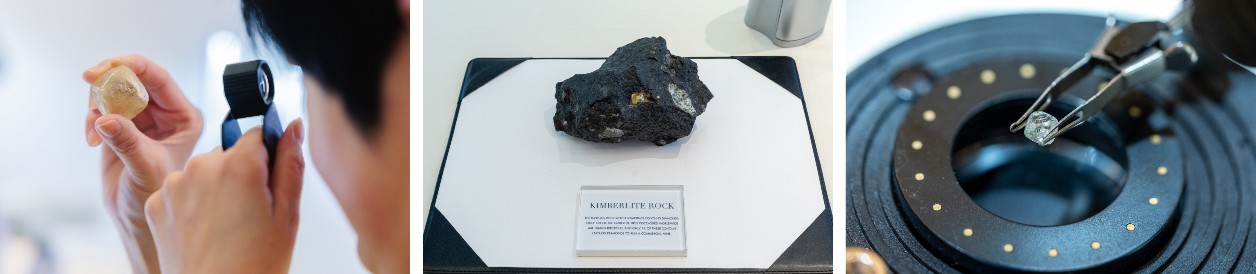 现场特别展出三颗由戴比尔斯集团开采的珍贵天然钻石原石:包括一颗重约297克拉的原石、一颗嵌于金伯利岩石的22克拉原石,以及一颗极为罕见的名为“跳动的心”(Beating Heart) 的0.329克拉原石——其内部还嵌有一颗可自由移动的小钻石,形成了“钻中钻”的独特构造,生动展现了天然钻石在大自然形成过程中的非凡地质奇迹。这颗非凡的钻石原石由戴比尔斯钻石研究机构进行专业分析,完整追溯其从孕育到问世的珍贵历程,并记录于Tracr区块链平台。参与课程的嘉宾均获颁戴比尔斯钻石研究机构的认证证书。