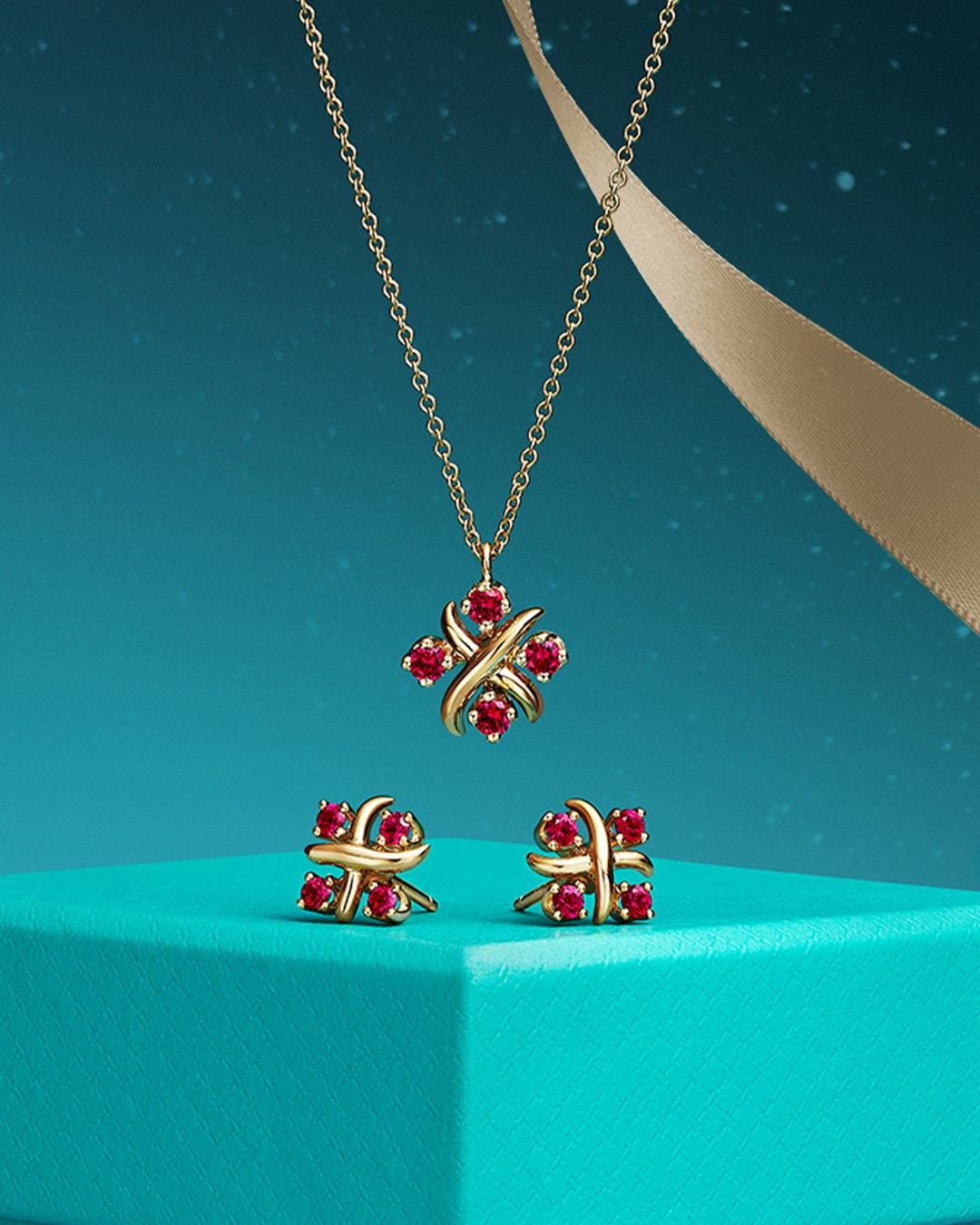 从上至下:让·史隆伯杰系列18K玫瑰金及铂金镶钻Sixteen Stone十六石戒指、让·史隆伯杰系列18K黄金镶嵌红宝石Sixteen Stone十六石项链及耳环、Tiffany Soleste®系列铂金镶钻戒指