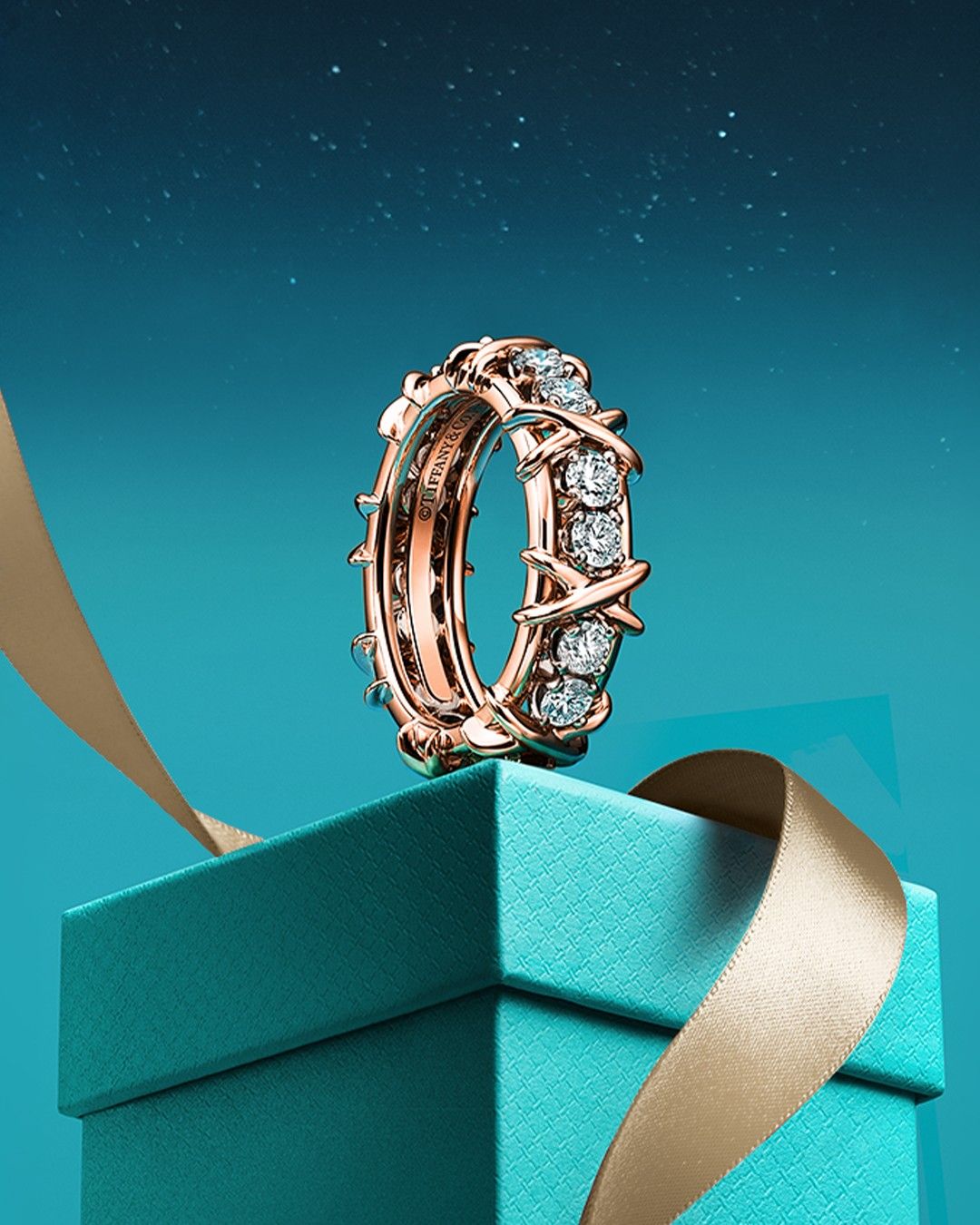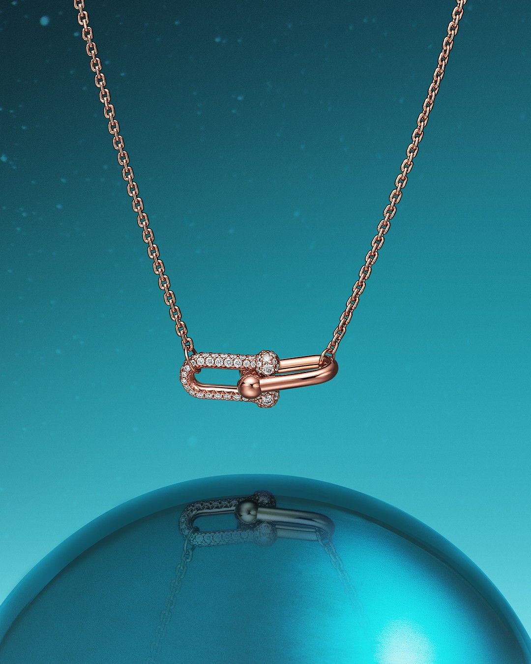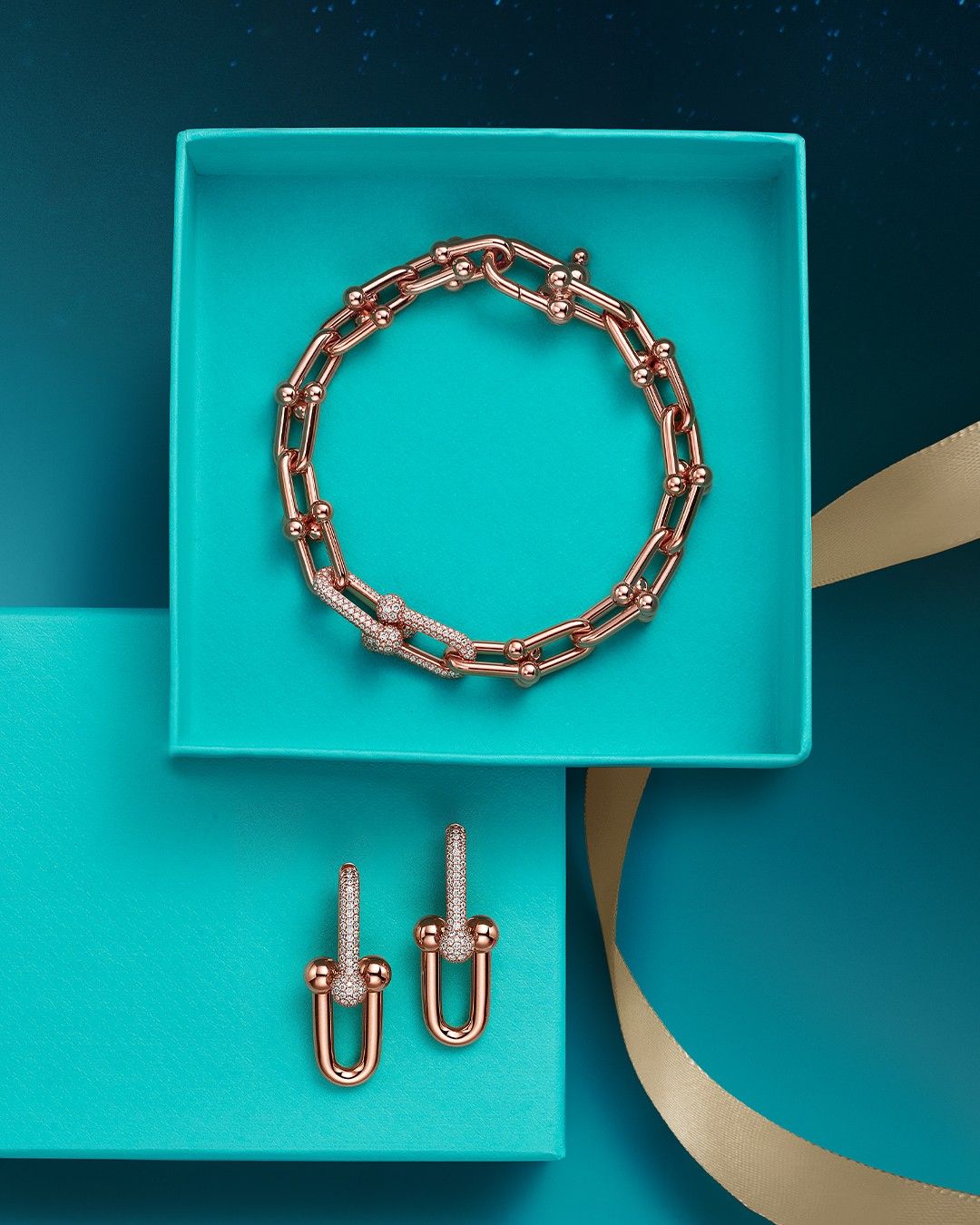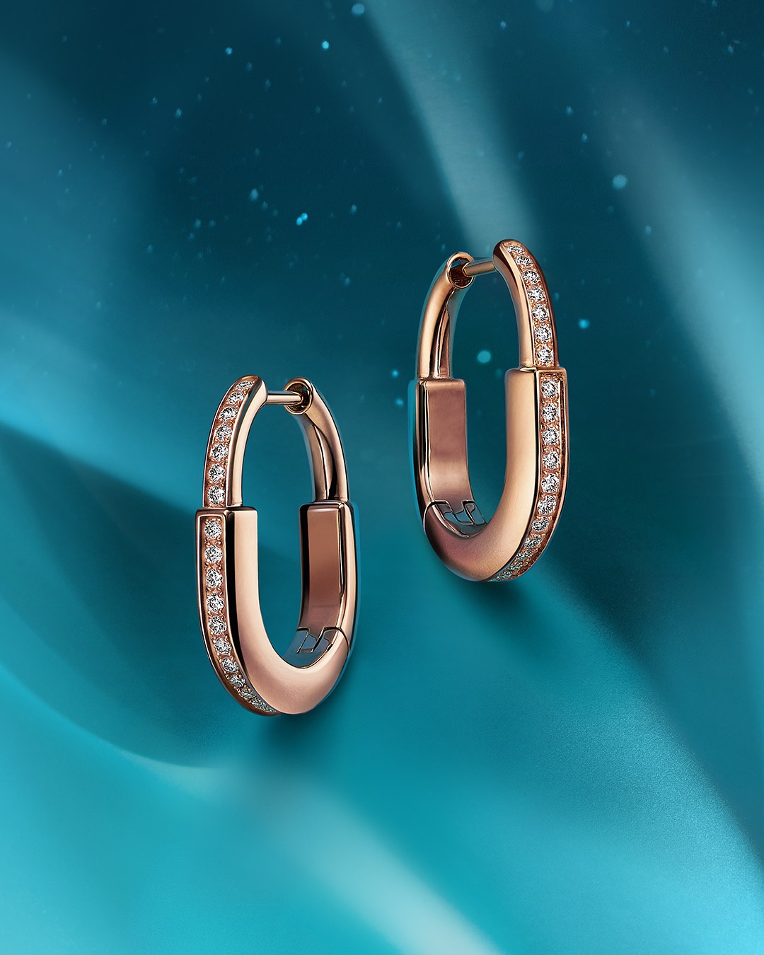从上至下:Tiffany T系列T1 18K黄金镶钻戒指、Tiffany Knot系列新春全球首发款项链、Tiffany Lock系列18K玫瑰金铺镶钻石小号耳环