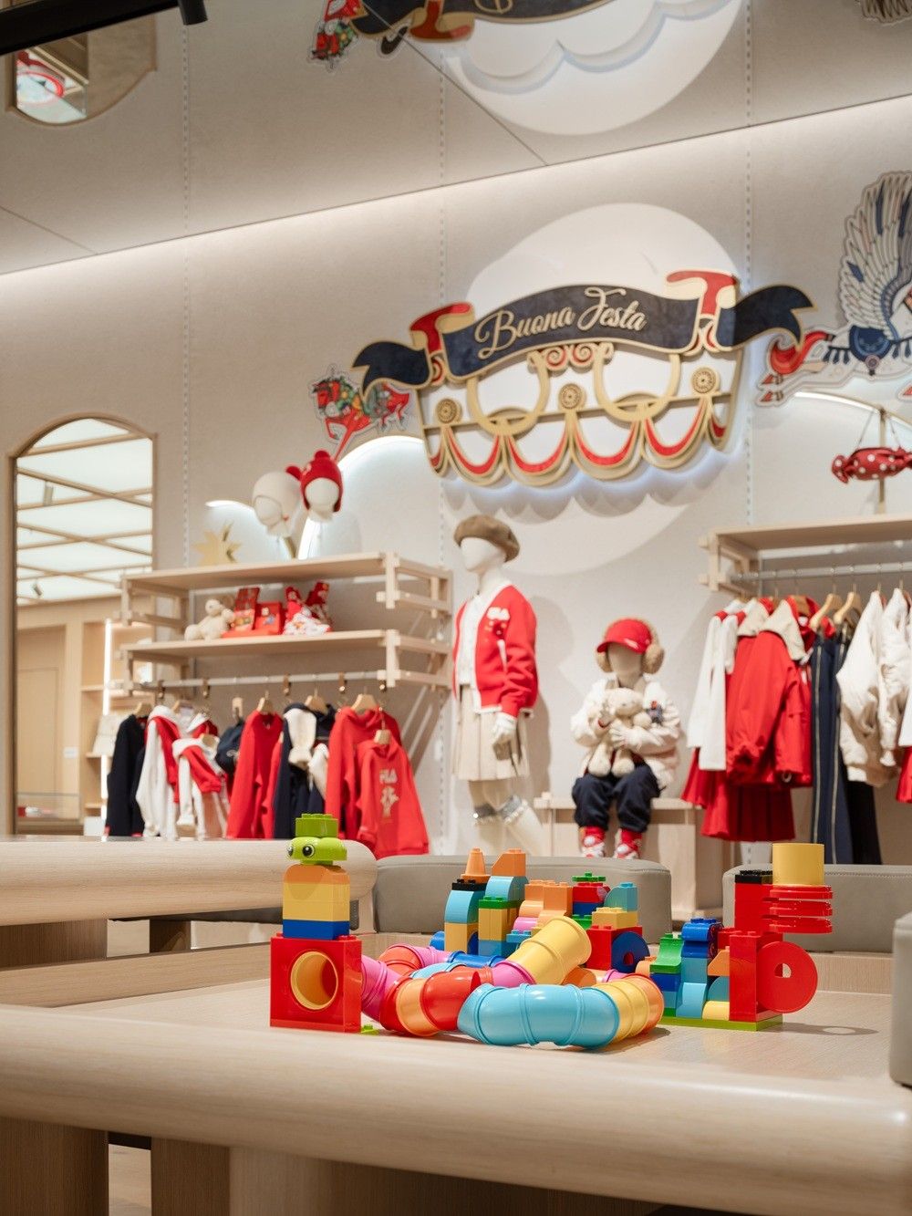 空间灵感取自唐朝的骆驼商队与满载奇珍的西域宝箱,利用可玩、可画、可探险的互动设计,打造出一个激发想象力、促进亲子互动的趣味式“探险乐园”。通过进一步划分出的大童区、小童区及鞋履区,令不同年龄段的孩子都能在这里针对性地挑选到符合需求的高品质鞋服。