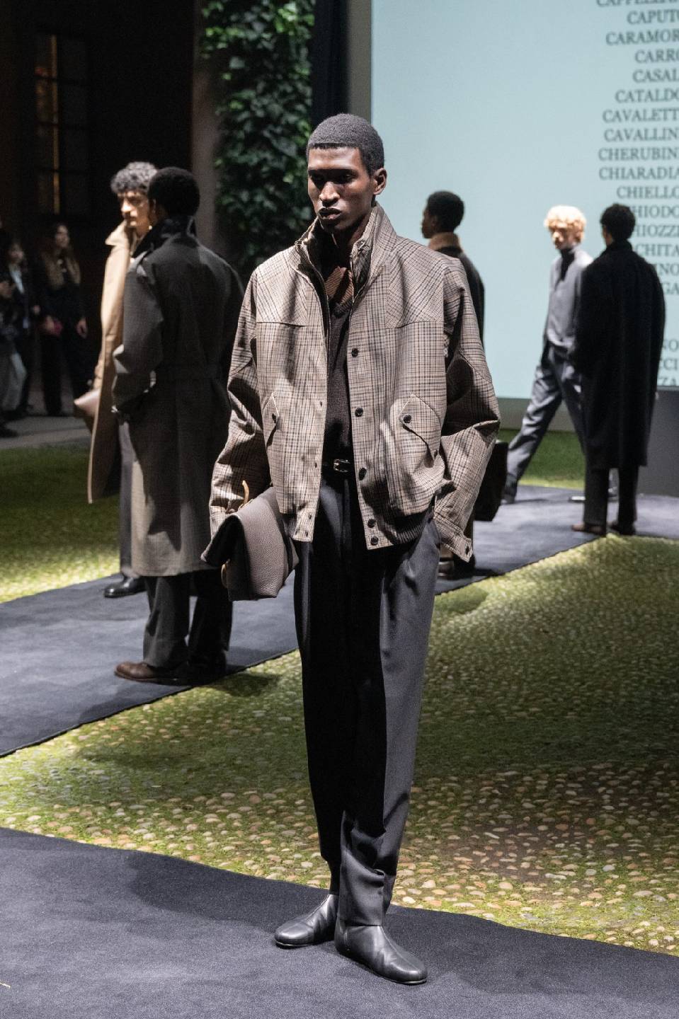 当影片落幕,模特们从银幕中迈步而出,踏上嵌有复古座椅的影院秀场。模特行走之际,秀场背景屏滚动播放片尾字幕,以字母排序逐一列出为品牌创意传承倾注心血的全体员工姓名,以此致敬每一位Corneliani的缔造者。