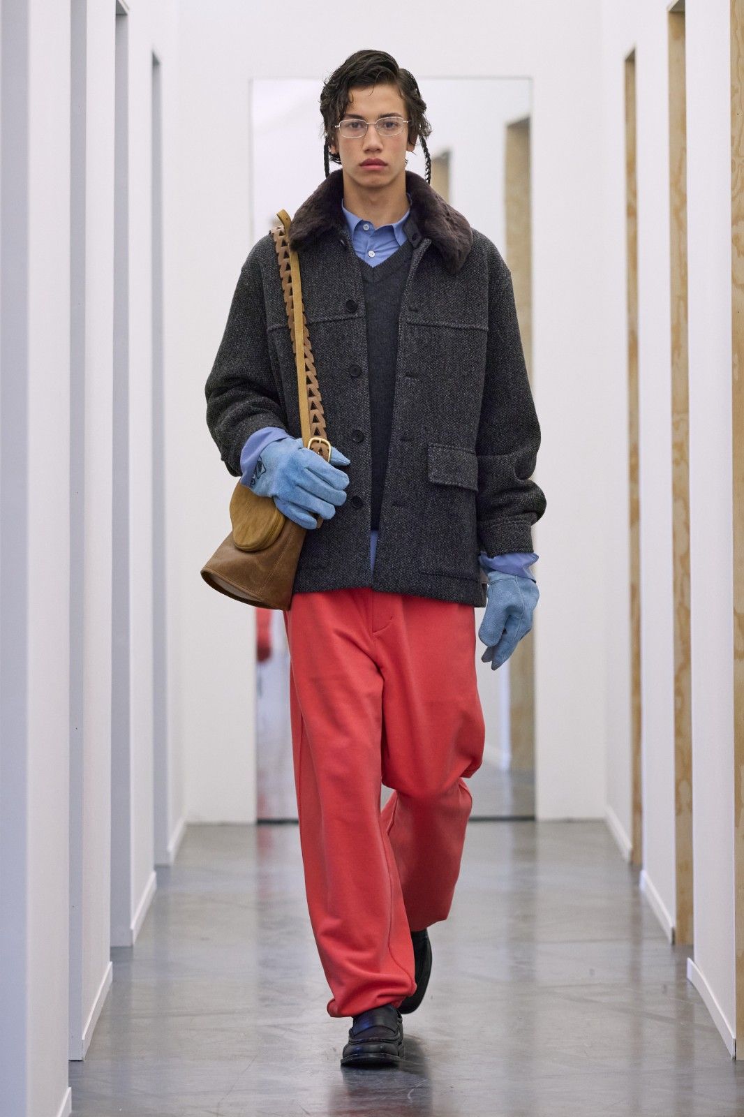 本系列植根于经典男装准则,经提炼、调整并刻意营造不安定感。通过参考办公室场景下的冬季叠穿,剪裁被赋予新的体量。切斯特菲尔德大衣、精准的衬衫与领带组合以及定制夹克,建立起熟悉的框架。裤装通过深褶、宽大的翻边引入体积感和动感。花呢、鼹鼠皮、人字纹等传统面料强化了恒久感,并与暗示穿着、过渡和使用而非珍藏的轻盈姿态和瞬时感形成对比。