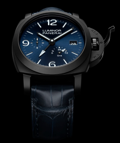 PAM01574的三明治式表盘延续沛纳海对实用主义的不懈追求,表冠护桥装置、三明治式表盘与夜光显示等设计,最初均为满足特定功能而生,如今已成为Luminor庐米诺系列的标志性元素。新作搭配蓝色太阳放射纹三明治式表盘,5点钟位置设动力储存显示。表盘上镌刻“ORE”字样,在意大利语中意为“小时”,彰显沛纳海纯正的意式血统。此外,12小时第二时区指针、3点钟位置的经倒角处理的日历窗以及表盘边缘的轨道式分钟刻度,进一步提升了腕表的实用性,令分钟读数更为精准。时标、时针和分针涂覆白色Super-LumiNova® X2夜光涂层,呈现独特的绿色夜光,而动力储存显示和第二时区指针则涂覆蓝色Super-LumiNova® X1夜光涂层。