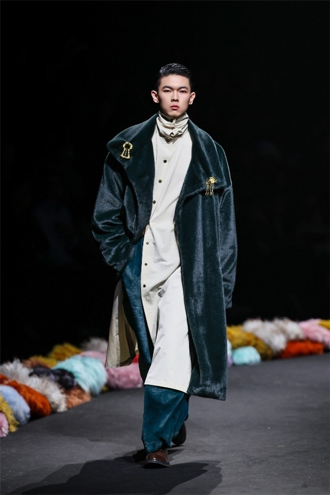 在“藏蕴”主题中,皮草设计回归复古新生、自然匠心等多重语境,打造出兼备自然主义与都市功能的系列单品。设计以香料红棕、霜草绿等“长期主义”的中性色为主调,在古韵匠心与文化包容的氛围里,传递出岁月温度与实用价值。纬一精选质感温暖奢雅的密实毛绒材质,搭配宽大松弛的廓形,完美演绎浪漫粗犷的乡野户外风格,并在长、短毛绒的组合中,为简约实穿单品强化轻机能风。而岩石地貌、生动苔藓和做旧压褶等肌理外观,则在多元化的应用场景中,铺陈出强烈的生态美学。