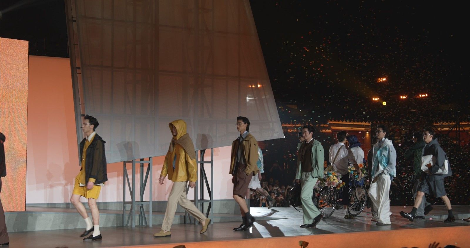 时尚焕新实业,产业联动全球,2026泉州时尚周全域精彩不断。4月17日晚,2026泉州时尚周启幕仪式暨首发大秀在世界文化遗产点——晋江梧林传统村落璀璨亮相。 侨批馆 、百年街巷、福船造型舞台依次点亮,在四月春风里,一段南音交织着闽南语的送信影像中,时尚模特穿着泉州品牌服饰的身影从街巷侨厝里缓缓出现。面料在光影中流转呼吸,红砖古厝的斑驳纹理化作印花,海丝的浪花、蟳埔的簪花,都在一针一线间低语。这场以“多彩商旅,穿行世界”为主题的大秀,将千年海丝文化与当代国潮时尚完美融合,为现场观众带来一场跨越时空的视觉盛宴。