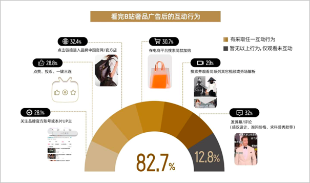 基于对平台生态与人群特征的深度洞察,报告发现,B站美奢广告可有效提高用户对品牌的购买意愿。76.2%的用户看完奢品广告后对品牌的购买意愿提升了,更是激发87.2%的用户产生互动行为。