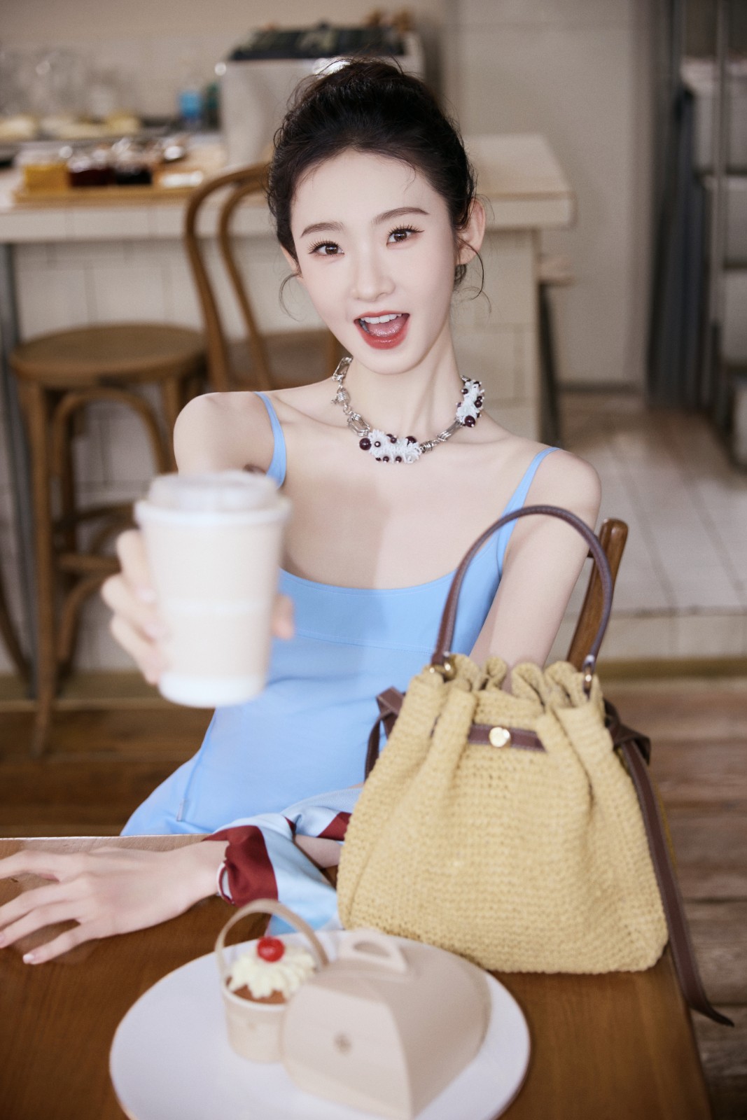演员张艺凡牛仔工装夹克,细肩带连衣裙,ROMY凉鞋,珠饰项链,几何图案桑蚕丝方巾,ROMY双面麂皮腰带,小鱼包挂胸针,携ROMY水桶包。