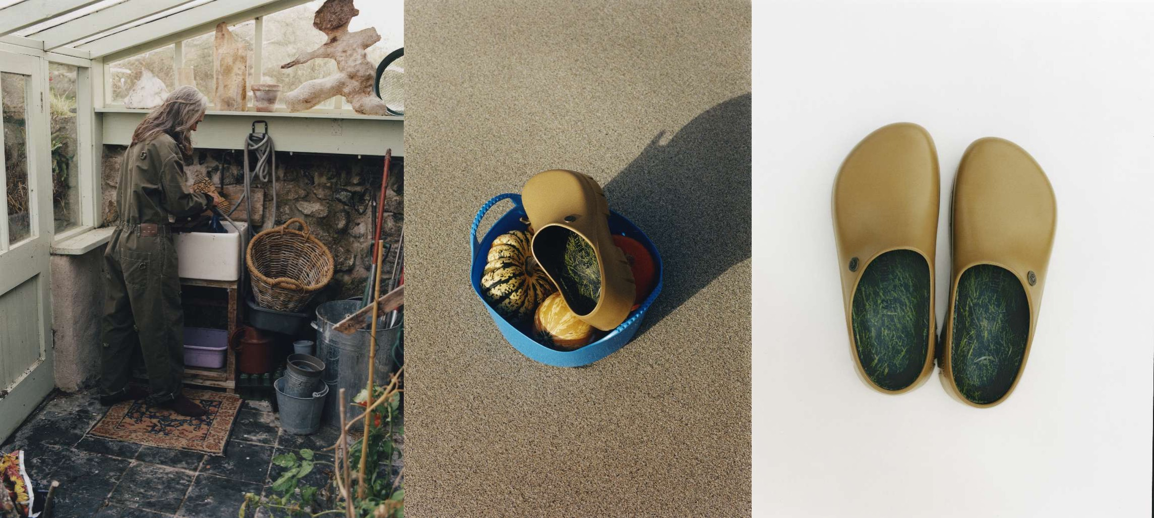 园丁 (The Gardener) 身着水洗斜纹钩花连体裤——历经岁月与劳作的打磨,变得柔软舒适,成为日常制服的恒定要素——搭配全新演绎的 Super Birki 2.0,采用棕褐色鞋身,配以草地印花鞋垫。呈现一种细心呵护、反复穿着、日常使用的独特韵律。