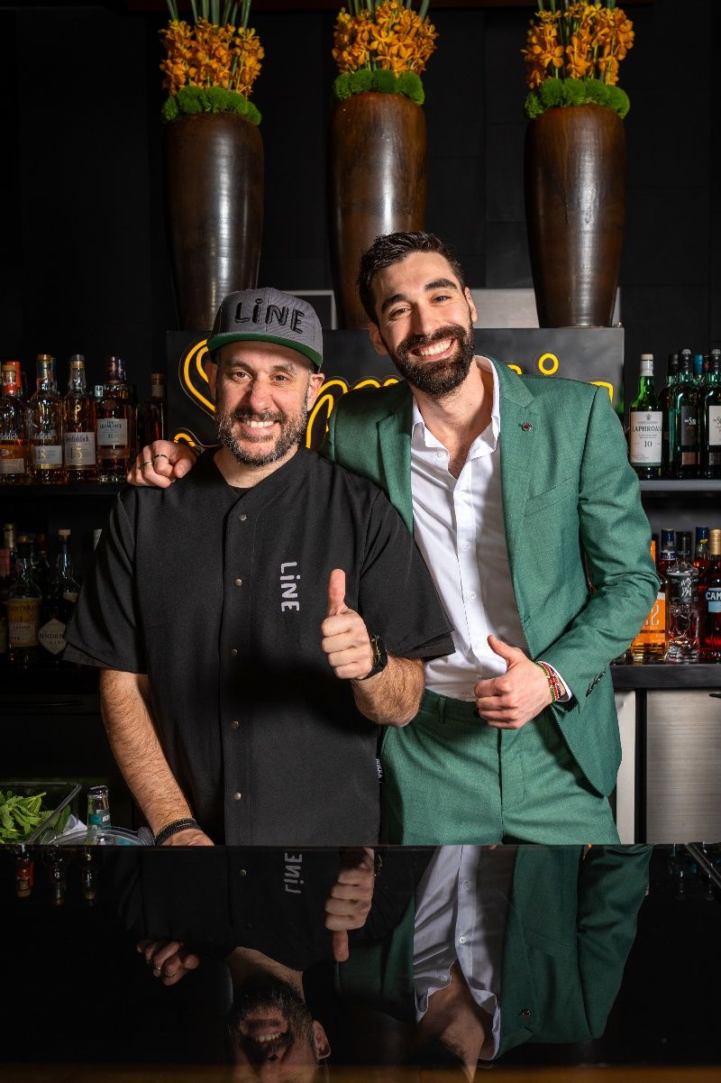 世界排名第8位的希腊 LINE 酒吧联合主理人Nikos Bakoulis (左)与上海宝格丽酒吧首席调酒师Riccardo Cascione(右)