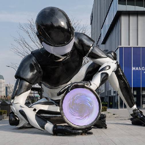 特罗斯(TROS)是古希腊神话里特洛伊王国的建立者,持镜而坐的机器人特罗斯是被人创造出的“件”(Ware)。这件被安置在广场上的交互艺术装置,旨在在作品与观众之间建立联系,特罗斯坐向真实的世界,以手中的镜子为观众打开人(Human)与人工智能(AI)之间的对话。镜内外是幻象、清醒、现实与梦境的几重映射,延伸向更美而不可感知的无界世界,也许是人工智能发展为人类开启的新维度的认知世界。