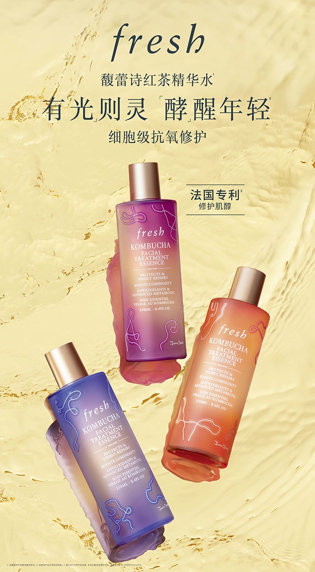 肌肤每天都在承受外界侵害,持续性的压力会影响肌肤自我防御系统的正常运转。当肌肤自我防御系统减弱,外界压力就会带来各种肌肤问题:暗沉,不均,岁月痕迹(细纹&毛孔)以及干燥。fresh馥蕾诗红茶精华水由此应运而生,凝萃细胞级抗氧修护力,「酵」醒肌肤嫩·透·光。甄选源自喜马拉雅山脉的黄金芽 ,经双重发酵, 凝练强抗氧小分子,为肌肤拉起抗氧双防线,细腻渗透直达肌肤深处20层以下。更含LVMH集团法国专利修护肌醇促进表皮细胞分泌自我修护酶。青蒿花提取物则使肌肤更加均匀、焕亮。外防御,内防护,深修护。