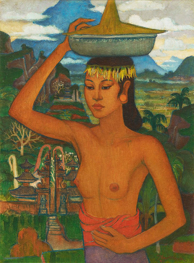 本作的人物对象是迈尔的灵感缪思—妮奥曼・林旁。她头上顶着祭品,身躯几乎占据了整幅画,带来震撼的视觉冲击,背景则有峇里茂盛的热带森林、高耸的火山和传统寺庙。迈尔的构图与达芬奇的《蒙娜丽莎》极为相似,对象的三七分肖像,映衬于半幻想的热带景貌前方,而景色中各种细节均一丝不苟。