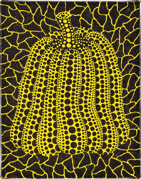 草间弥生的南瓜是当代艺术中最具代表性和辨识度的图像之一。《南瓜》由鲜明的金黄色颜料与黑色背景绘制而成,并首呈拍场。草间弥生著名的波点图案的设计十分精致,让人想起南瓜皮的自然纹理与弧度。