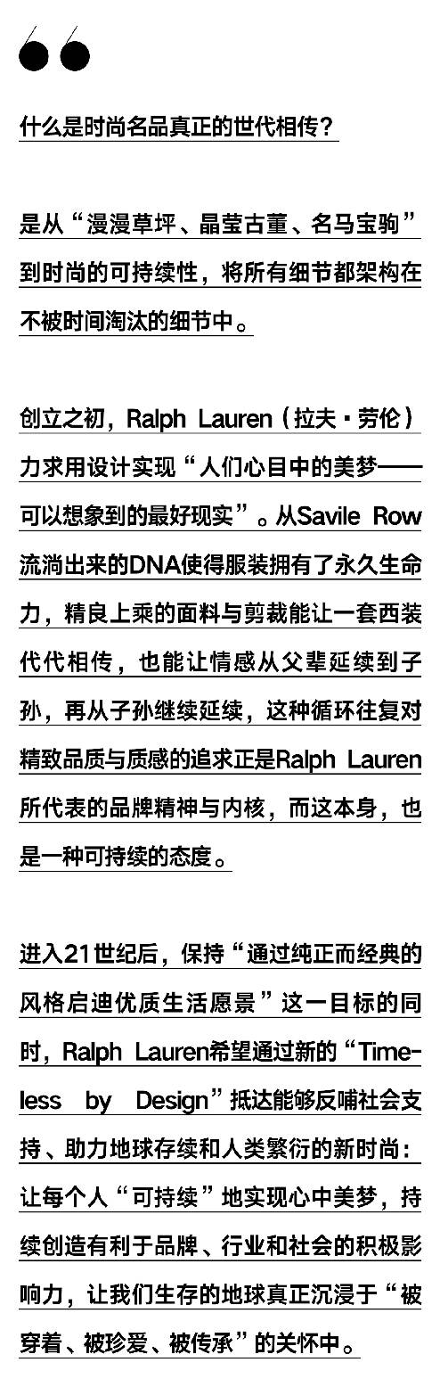 Ralph Lauren相信时尚和风格经久不衰,其背后则潜藏着关于生活、品质、耐力和永恒的哲学。“Ralph Lauren不仅仅许下承诺,我们正在做的事情将影响和改变我们的行业。”