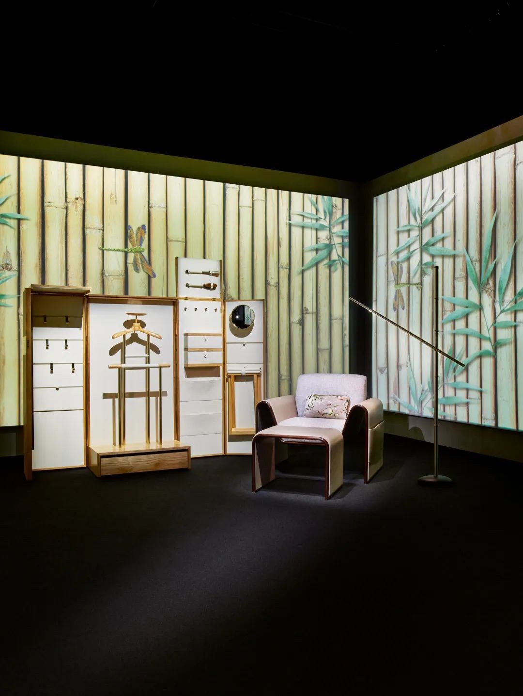 植物世界也是Armani美学词汇中一个反复出现的元素。竖直的竹子是其中的首选元素。竹林以及轻轻停于其上蜻蜓的背景前,陈列了饰以细棱纹泡桐的SIDE木屏风及其他一些质感轻盈、仿佛摆脱了重力的作品:框架为卡纳莱托胡桃木的SHARON椅子,既紧凑又优雅,同时颇具复古魅力的SUITE衣物架。