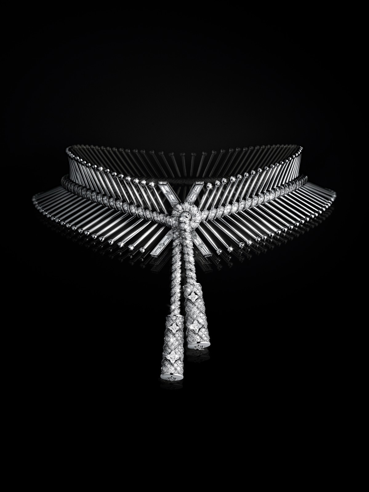 “无垠”(Myriad)主题象征永不停歇的运动,令人沉醉的未来主义风格珠宝自DNA双螺旋结构汲取灵感,致意品牌的经典元素。与第一篇章中的耀目白金相呼应,该主题推出一条灵动项链和配套手镯,手镯镶嵌灿若珠宝的独立饰钉,呈现魅惑的螺旋波浪观感,蜿蜒而成微妙的V字形。一条摄人心魄的绳索在项链和手镯中相互交织和缠绕,为其注入柔美飘逸之感,呼应路易威登最早用于运输硬箱的坚韧绳索。此外,一枚戒指和数对耳环均镶嵌LV Monogram星形切割钻石,钻石相互交织成网状结构,散发璀璨光芒和优雅气质。