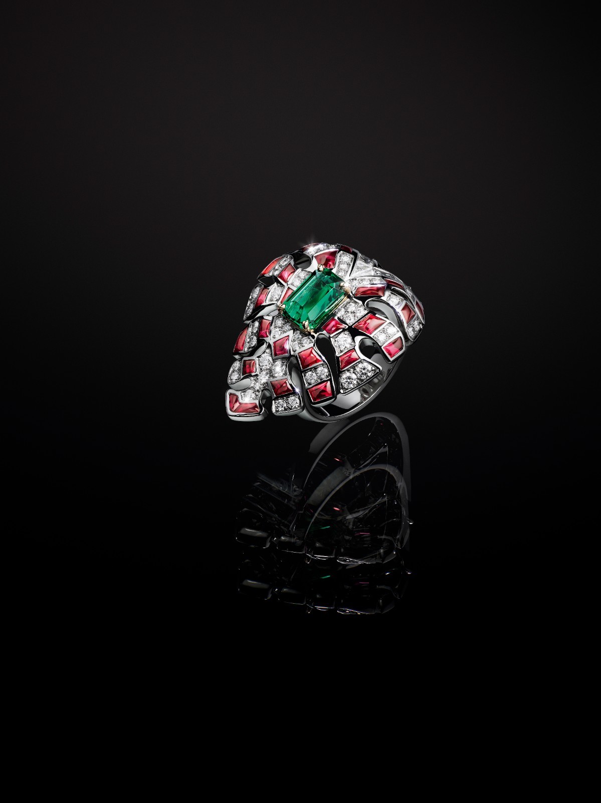 “植韵”(Plants)主题在“深时之旅”(Deep Time)高级珠宝系列中展现大自然的纷繁多姿,如今在第二篇章中更为直观地诠释生机盎然的动植物形态。一条奢华项链再现大自然的枝繁叶茂,相互交织的铂金和黄金藤曼宛如翻卷状态的奢华围巾,顶端镶嵌三枚精妙非凡的叶片,其中两片采用可拆卸设计,可转化为胸针单独佩戴。每枚叶片均饰有镶嵌钻石的V字,绽放耀目光泽。整件作品由302颗定制切割钻石和132颗赞比亚祖母绿宝石构成,这些采用定制切割的宝石散发罕见蓝色调。配套戒指镶嵌一颗2.29克拉八角形阶梯型切割赞比亚祖母绿宝石,两侧配以两颗梨形切割钻石。此外,一条更适合日常佩戴的项链在偏心位置点缀一枚叶片,44颗定制切割红宝石簇拥一颗5.57克拉祖母绿宝石。