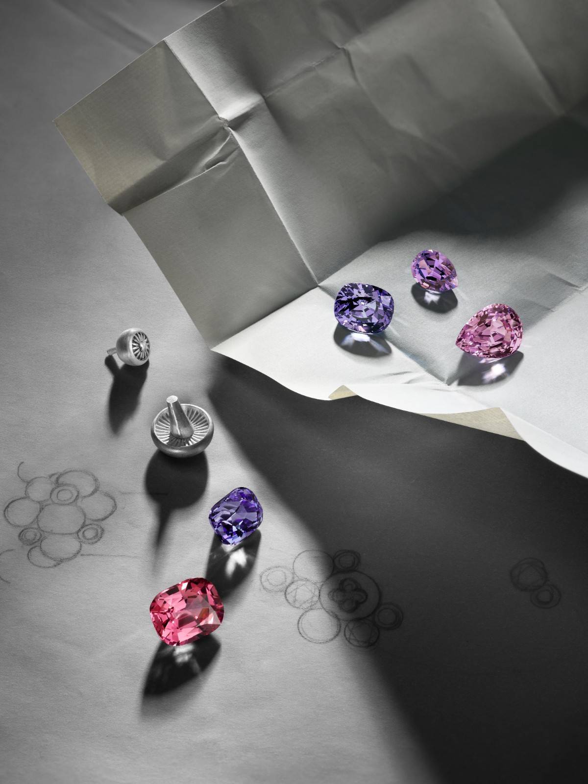作为本次史诗之旅的全新主题,“共生”(Symbiosis)主题标志着陆地早期生命形式的出现和首个有机生态系统的建立。真菌和菌丝体错综复杂的形态为Amfitheatrof带来了灵感,她沉迷于隐藏其中的内在联系和相互协作的共生关系。尖晶石是该主题的设计核心,这些来自越南和坦桑尼亚的宝石绽放粉色、紫色和淡蓝色的柔媚色调。一条精妙绝伦的多链式项链由一簇簇形态各异的尖晶石构成,呈现错落有致的丰盈量感,巧妙描摹大自然的动人奇观。凸圆形密镶钻石上覆有一层交替排布的LV Monogram星形切割钻石,进一步提升作品的层次感和比例美感。这条项链形象诠释了“共生”(Symbiosis)主题所彰示的有机精神和生命本质,耗时1381小时方可完成,每一处细节都需要一丝不苟的打磨;项链内侧也匠心雕琢出蘑菇图案,唯有佩戴者才能有幸见到。“共生”(Symbiosis)主题另有线条流畅的耳环和戒指,这些单品均由尖晶石、钻石和LV Monogram星形切割钻石镶嵌而成,共同谱写流光溢彩的谐美画卷。