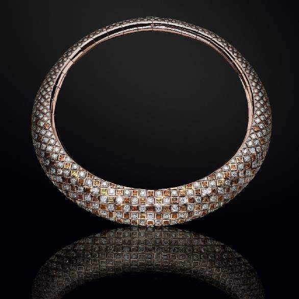 生命蓬勃发展,不断开辟新天地。“鳞纹”(Skin)主题呈现物质世界和自然世界中相互交错的几何图案,旨在探索生命模式中的特有联系。该主题作品摩登而不失精美,令人忆起蛇类鳞纹和品牌经典Damier棋盘格图案,宛如一曲致敬翁巴蓝宝石的颂歌,这些产自坦桑尼亚翁巴河的珍宝闪耀别具一格的橙粉色光辉。整套作品总共耗费近300颗翁巴蓝宝石,这些宝石均分别经过定制切割、排布和设计工序,从正方形、菱形到长方形,不一而足。翁巴蓝宝石的暖金色光泽在玫瑰金的映衬下更加耀眼,这也是Amfitheatrof首次将玫瑰金作为高级珠宝系列的单独主题,其积木般的棋盘格设计进一步烘托这套作品的独特配色。项链和配套手链展现丰盈量感,轻松贴合肌肤曲线,与之相配的是一枚造型出众的戒指和一对精致耳夹。