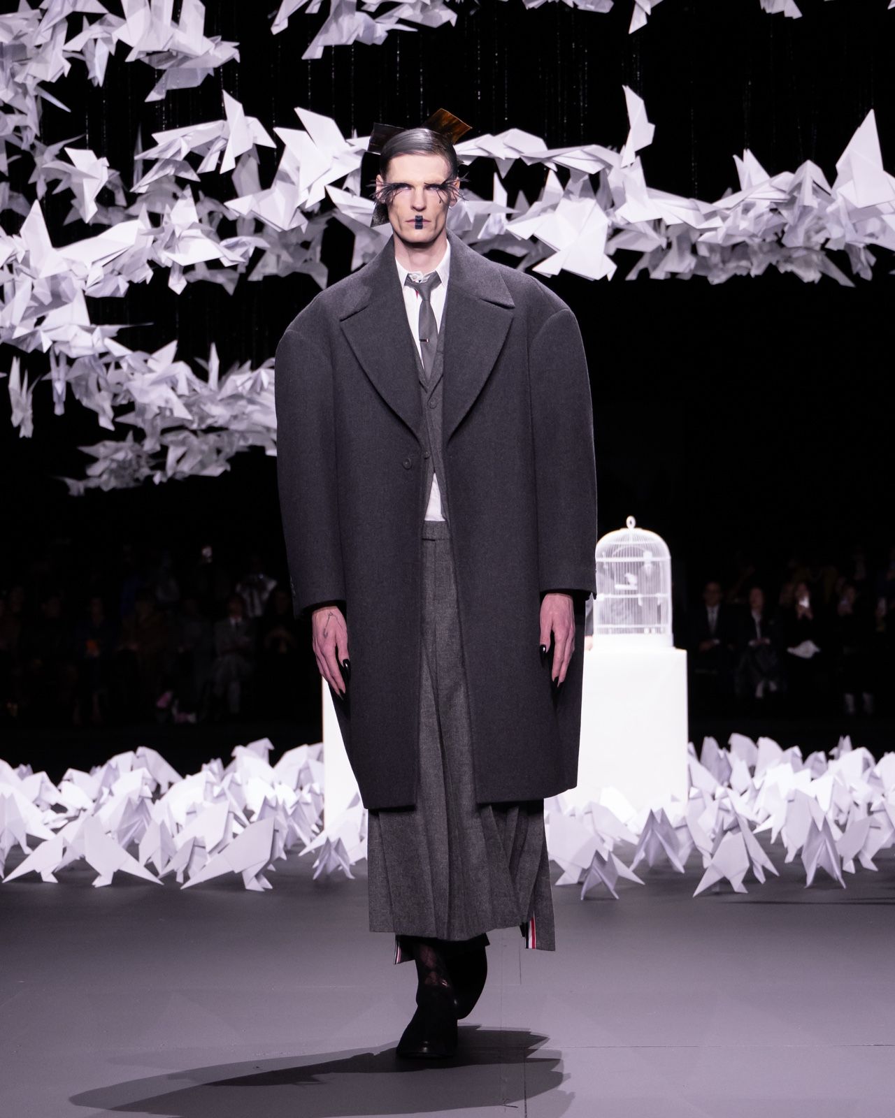 一对鸟类学家登场,身着连帽派克大衣与双面羊毛材质的thom browne标志性制服,半透明的菱格花纹长袜从过膝麂皮长靴中微微露出。他们坐在观鸟处——白色折叠桌椅旁,准备观察即将发生的一切。