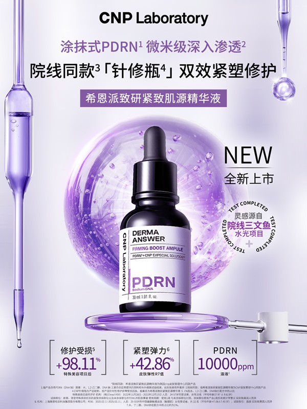 在当今护肤领域,"修护"已从简单的肌肤舒缓升级为对抗反复敏感的系统工程。传统修护产品往往止步于肌肤表层的暂时舒缓,未能触及敏感反复的根源,难以让肌肤得到有效的深层修护。为了让更多的消费者在日常护肤中能更高效修护反复屏障受损的肌肤,CNP调研韩国皮肤管理中心人气成分并结合29年的皮肤护理经验,以PDRN三文鱼水光项目[1]为灵感,通过LG研发中心不断实验和研究,以尖端科技攻克PDRN难吸收技术难题,深耕专研细胞修护潜能,创新推出院线同款[2]可涂抹式PDRN*- CNP针修瓶[3], 解锁PDRN修护紧致奥秘,高效透皮,深层修护,弹润紧致,革新无痛水光修护的新体验。