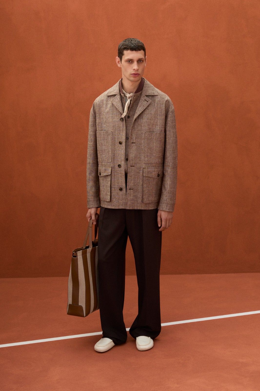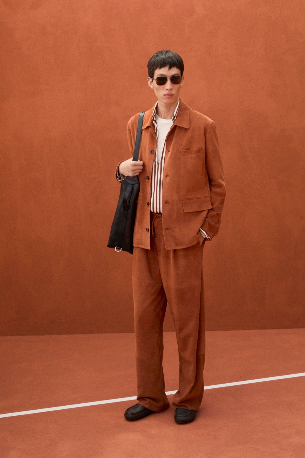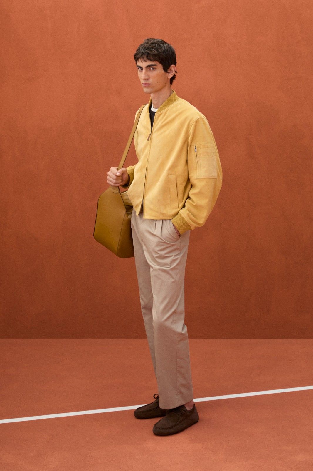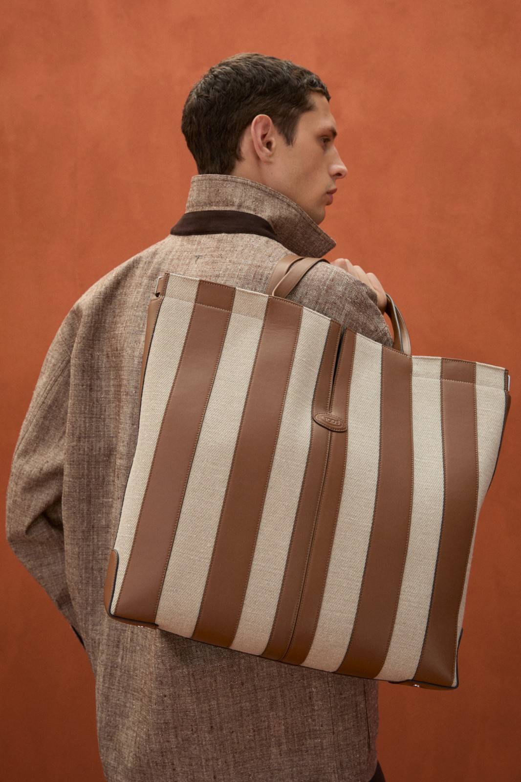 本季系列最引人注目的材质创新当属TOD’S Pashmy——这一突破性材质历经潜心研发,精选全球最顶级的原皮,通过独创的工艺打造而成。Pashmy呈现出令人惊叹的材质特性:触感如丝绸般顺滑细腻,却保有皮革特有的高级质感,轻盈柔韧。本季Pashmy材质融入三大经典单品,重塑男士衣橱的优雅氛围,聚焦大地色系,从温润的驼色到明亮的黄色,勾勒出自然与都市交融的美学图景。其中,经过重新诠释的飞行员夹克保留军装硬朗廓形,Pashmy材质赋予其超乎想象的轻盈与舒适,走动间尽显洒脱姿态;非结构化西装外套在Pashmy的加持下,打破传统正装的束缚,以随性剪裁与细腻质感,塑造出当代绅士从容不迫的精致风范;翻领教练夹克以不同条纹、格纹与Pashmy材质碰撞出独特的复古韵味。作为系列焦点的橘棕色教练夹克尤为吸睛,以Pashmy材质打造挺括版型,内搭的白棕相间条纹衬衫,层次分明又不失清爽,为整体造型注入一抹时髦活力,于举手投足间展现绅雅之姿。