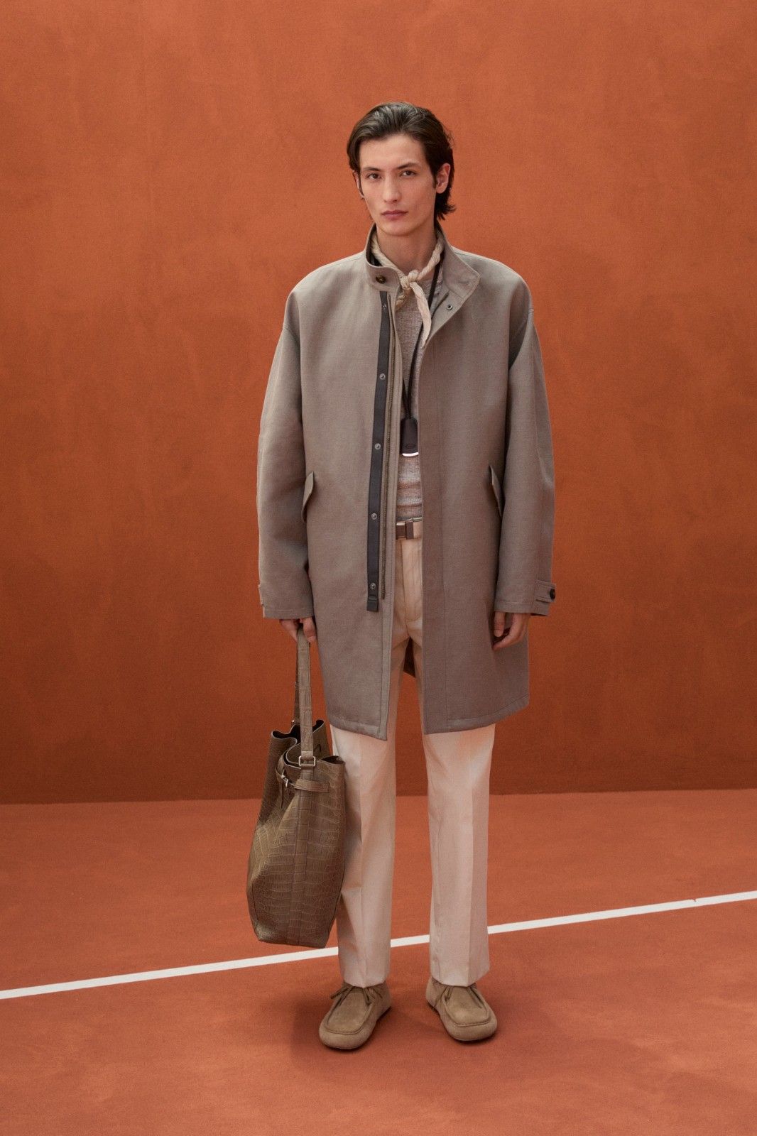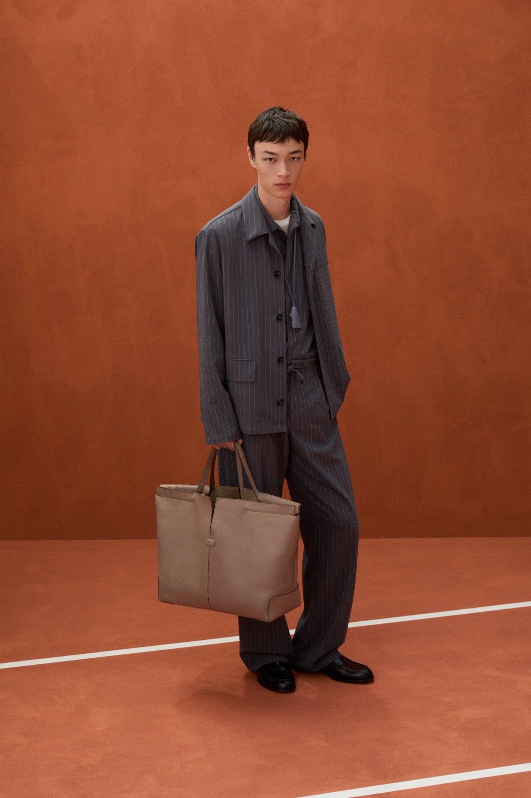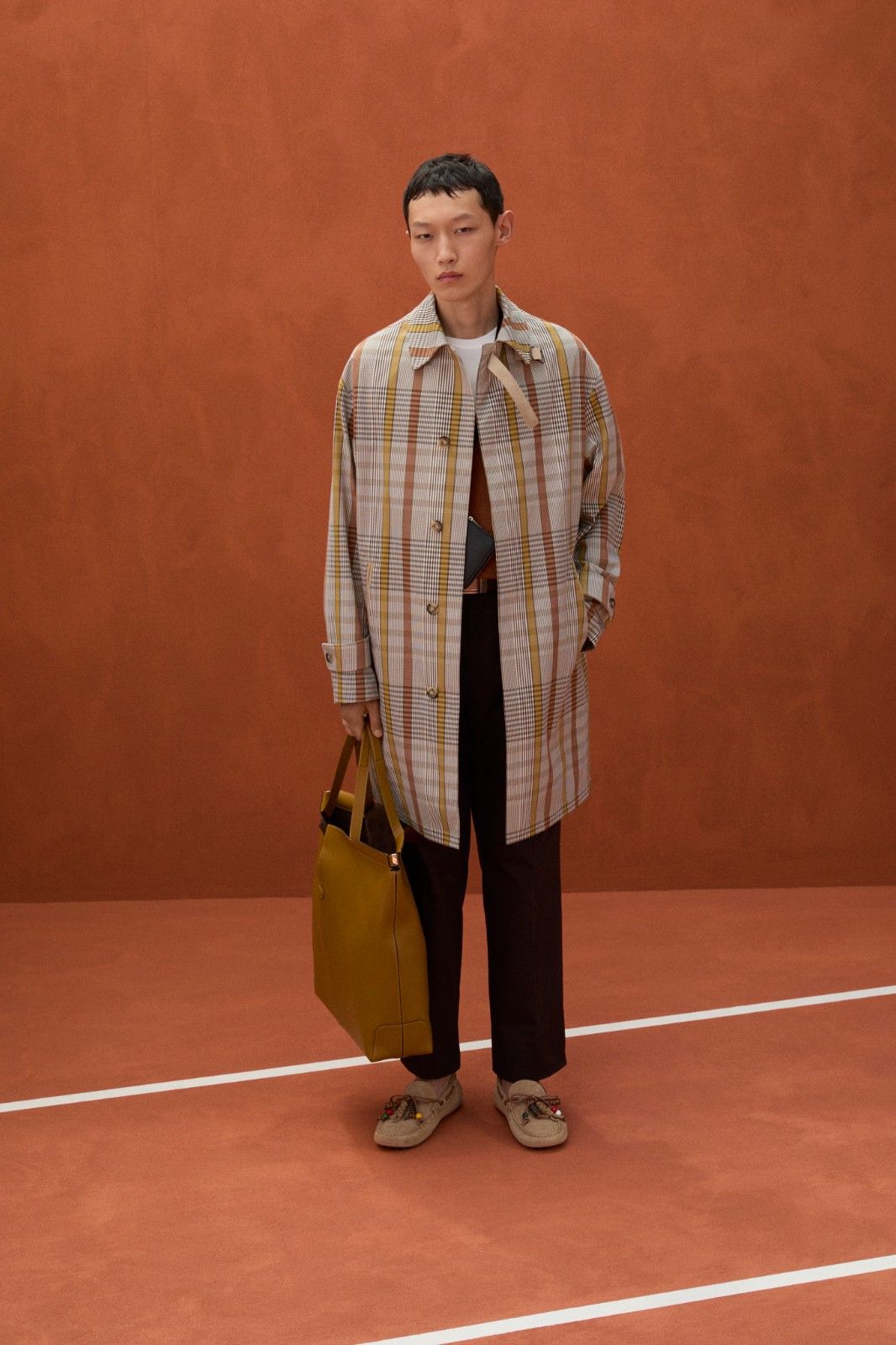 本季系列最引人注目的材质创新当属TOD’S Pashmy——这一突破性材质历经潜心研发,精选全球最顶级的原皮,通过独创的工艺打造而成。Pashmy呈现出令人惊叹的材质特性:触感如丝绸般顺滑细腻,却保有皮革特有的高级质感,轻盈柔韧。本季Pashmy材质融入三大经典单品,重塑男士衣橱的优雅氛围,聚焦大地色系,从温润的驼色到明亮的黄色,勾勒出自然与都市交融的美学图景。其中,经过重新诠释的飞行员夹克保留军装硬朗廓形,Pashmy材质赋予其超乎想象的轻盈与舒适,走动间尽显洒脱姿态;非结构化西装外套在Pashmy的加持下,打破传统正装的束缚,以随性剪裁与细腻质感,塑造出当代绅士从容不迫的精致风范;翻领教练夹克以不同条纹、格纹与Pashmy材质碰撞出独特的复古韵味。作为系列焦点的橘棕色教练夹克尤为吸睛,以Pashmy材质打造挺括版型,内搭的白棕相间条纹衬衫,层次分明又不失清爽,为整体造型注入一抹时髦活力,于举手投足间展现绅雅之姿。