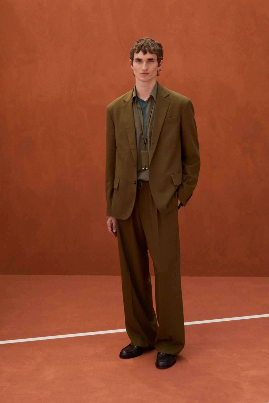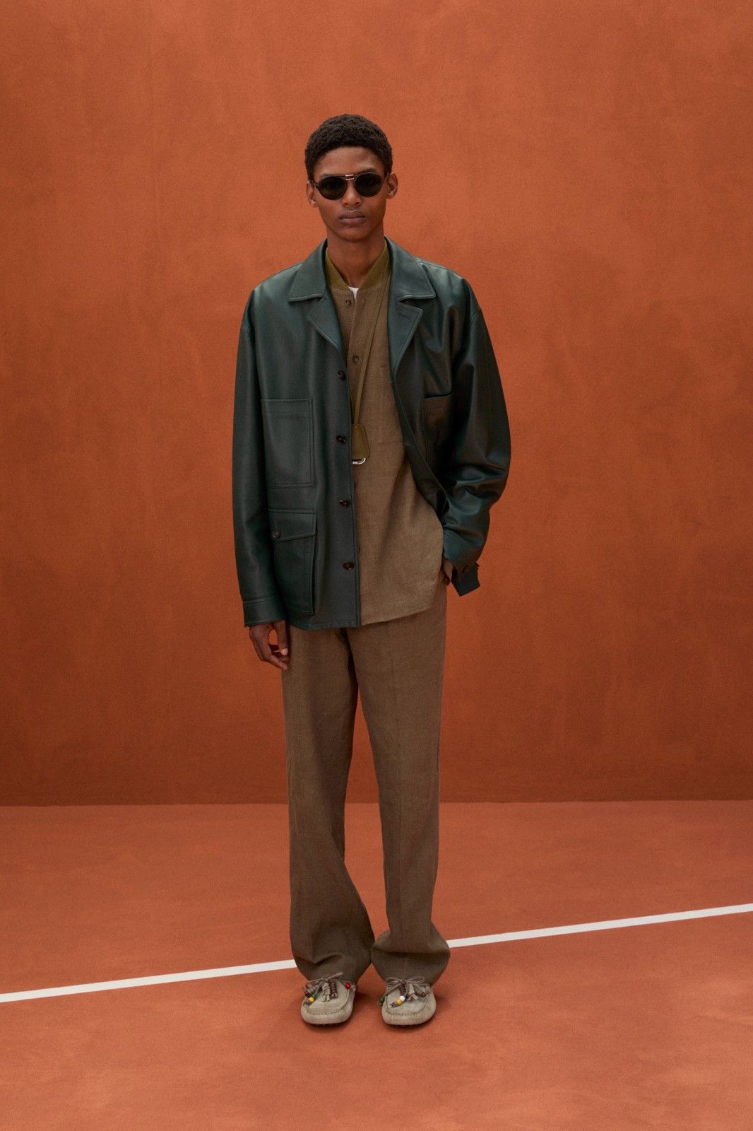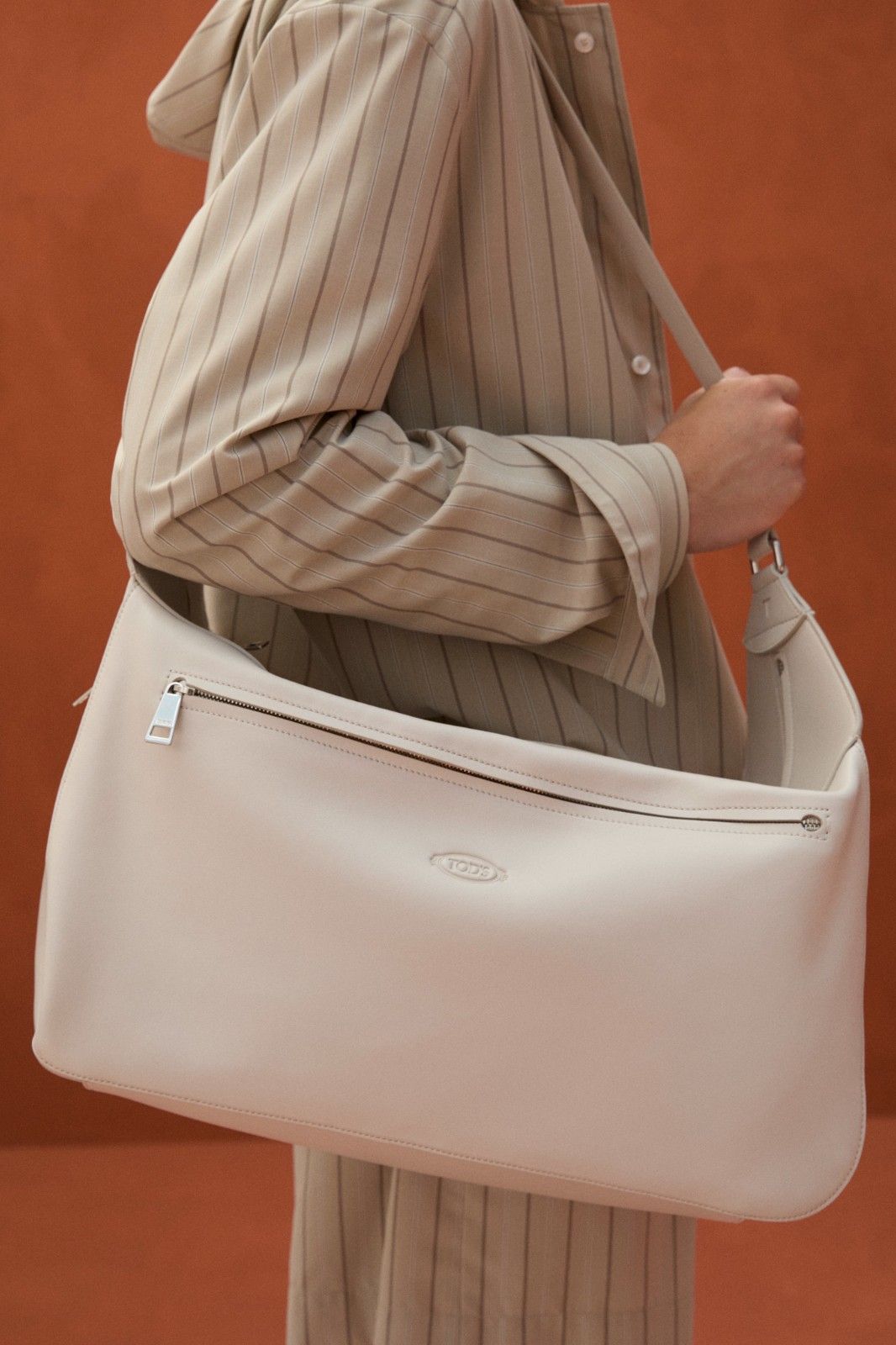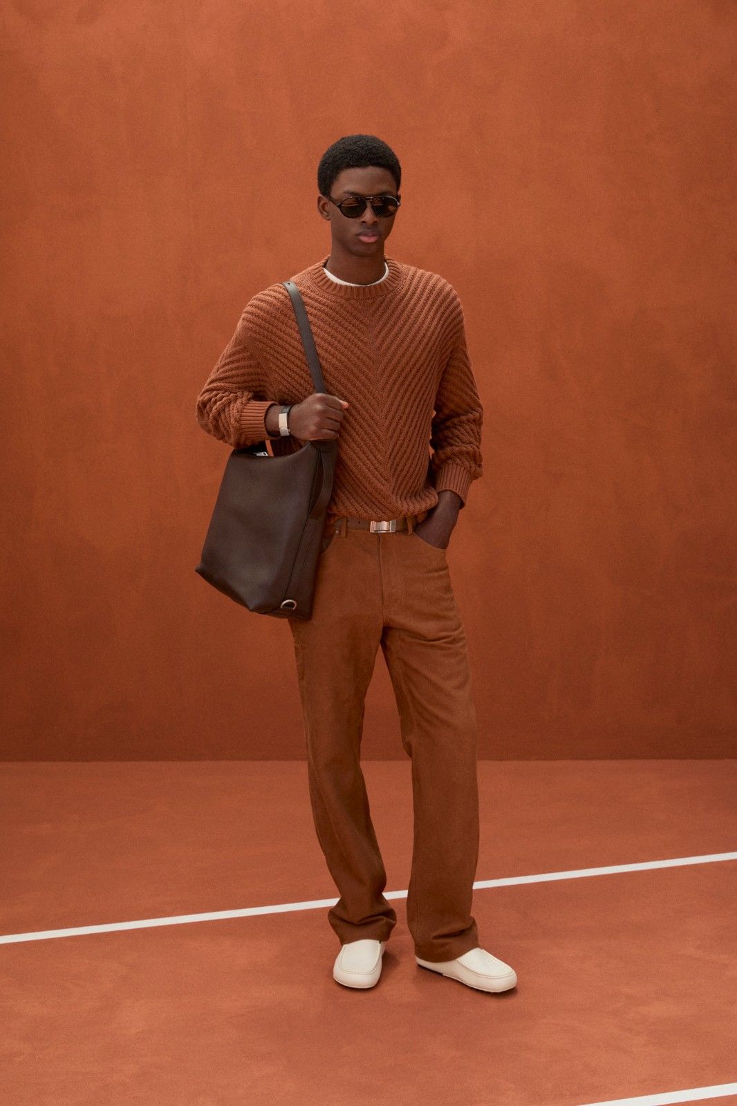 本季系列最引人注目的材质创新当属TOD’S Pashmy——这一突破性材质历经潜心研发,精选全球最顶级的原皮,通过独创的工艺打造而成。Pashmy呈现出令人惊叹的材质特性:触感如丝绸般顺滑细腻,却保有皮革特有的高级质感,轻盈柔韧。本季Pashmy材质融入三大经典单品,重塑男士衣橱的优雅氛围,聚焦大地色系,从温润的驼色到明亮的黄色,勾勒出自然与都市交融的美学图景。其中,经过重新诠释的飞行员夹克保留军装硬朗廓形,Pashmy材质赋予其超乎想象的轻盈与舒适,走动间尽显洒脱姿态;非结构化西装外套在Pashmy的加持下,打破传统正装的束缚,以随性剪裁与细腻质感,塑造出当代绅士从容不迫的精致风范;翻领教练夹克以不同条纹、格纹与Pashmy材质碰撞出独特的复古韵味。作为系列焦点的橘棕色教练夹克尤为吸睛,以Pashmy材质打造挺括版型,内搭的白棕相间条纹衬衫,层次分明又不失清爽,为整体造型注入一抹时髦活力,于举手投足间展现绅雅之姿。