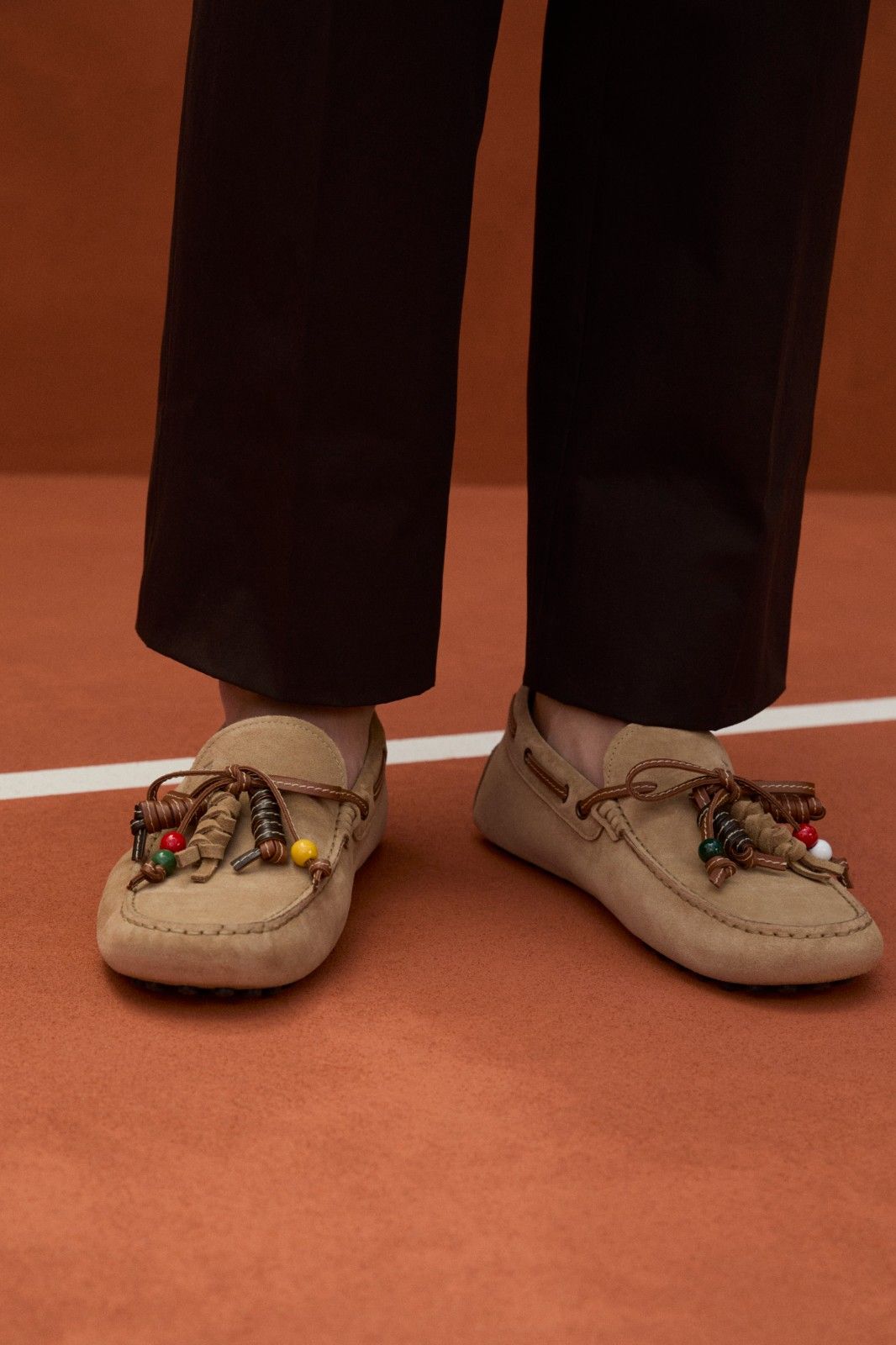 经典元素焕发新生:Bubble Gommino以夸张放大的豆豆鞋底重塑廓形并融入系带元素,巧妙兼容光面皮革及绒面皮革,利落质感和复古格调并存,展现出在风格塑造上的强大包容性;航海灵感的系带船鞋打破传统桎梏,彩色小串珠精心排列,为简洁的船鞋注入年轻活力;而荔枝皮踩跟拖鞋则以慵懒姿态诠释都市闲适美学,细腻的荔枝皮纹理与圆润豆豆相互映衬,打造随性休闲风范。