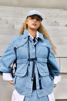 男士牛仔软壳夹克,以宽松的廓形剪裁呈现,搭配同款面料长裤,打造叠穿层次⻛格。外搭模块化牛仔马甲,立体贴袋可拆卸变成斜挎包,增添更多收纳空间,彰显机能设计与实用的精妙结合。女士模块化牛仔夹克,凭借A字廓形与肩部复古灵感设计,与女士短款牛仔背心搭配,一件解锁复古丹宁⻛格;下装搭配女士喇叭牛仔长裙,自由塑造都市多元造型。