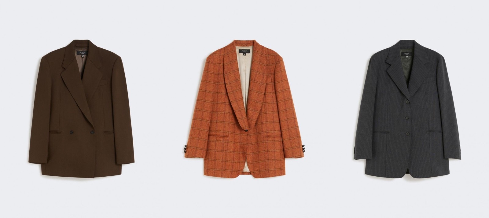 廓形宽大的茧形大衣采用宽领及背面打褶设计,展现丰富的层次感;单排扣大衣则以人字纹羊毛制成,散发端庄优雅气质。