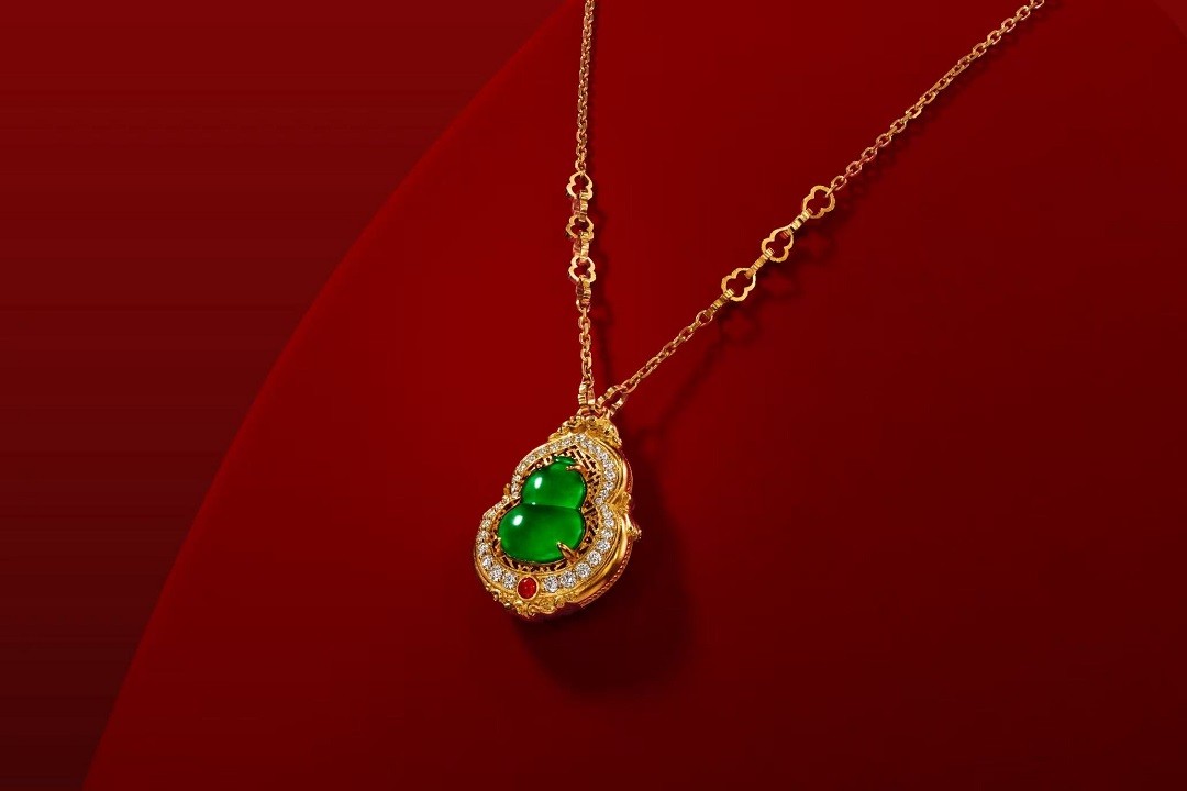 故宫系列另一款翡翠作品“福禄呈祥”撷取清·象牙雕大吉葫芦花囊为设计灵感。作品采用翠色欲流的晶莹翡翠,雕琢出葫芦的饱满形态,四周以镶嵌钻石的黄金环绕,富贵华丽,寓意长寿吉祥。该作品通过对文物中葫芦元素的提炼与重塑,生动诠释了中华传统美学与故宫文化的独特内涵。
