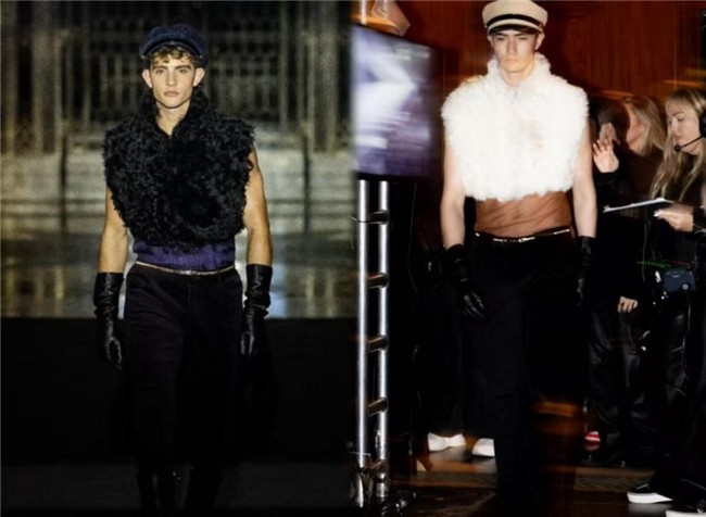 此外,棱纹千鸟格天鹅绒套装在经典图样与现代剪裁间之间探索的精妙平衡,“雾霾紫”翻毛麂皮拼皮夹克、经典黑色系灯芯绒直筒裤、创新解构的天然羊毛针织马甲等,借由时尚语言与“黄金时代”的跨时空对话,实现了复古情怀向着现代审美的灌注,使得经典元素在时尚的转译中既焕发了贴合当代审美的鲜活生机,又承载了岁月记忆的沉淀质感。