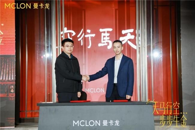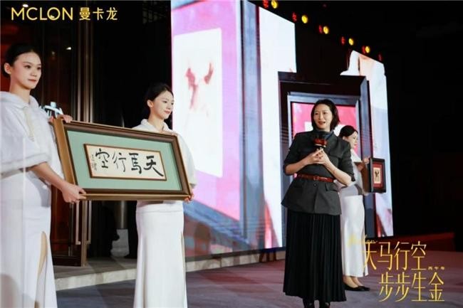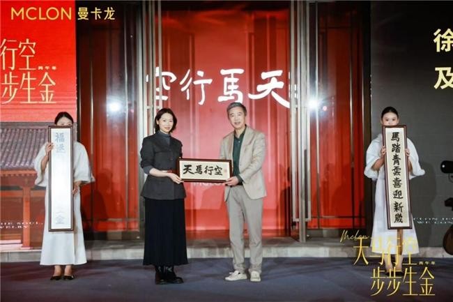 徐悲鸿美术馆馆长杨净将徐悲鸿之子徐庆平亲手题写的“天马行空-马年春联” 手书赠送给曼卡龙品牌,笔墨传递昂扬精神,也见证三方的深厚情谊。