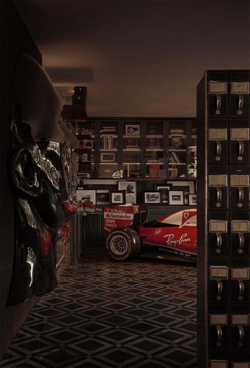入口右侧的限时展区以深色木材与玻璃构筑的沉稳基调打开文化气场,营造静谧克制的“私人收藏厅”氛围,几何石材地面与博物馆式陈列让机械、速度与文化在此缓缓铺展。作为雍熙荣的首个品牌合作,今年11月,法拉利将Kimi Räikkönen的Ferrari SF16-H(2016 Brazil Grand Prix 原车)及跃马新作Amalfi带入空间,注入鲜明的速度美学。展陈亦引入了经典老爷车收藏——梅赛德斯-奔驰190、路虎卫士Series II、阿斯顿·马丁DB4等,以沉稳复古的绅士情怀塑造对话场景,演绎凝聚品味、激发谈资的文化剧场。
